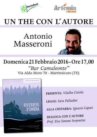 Inaugura Antonio Masseroni, un giovane autore e musicista di Roseto degli Abruzzi. Nel 2014 ha pubblicato “La nostalgia dell’acqua”, romanzo d’esordio letterario che ha riscosso grande successo tra critica e lettori.