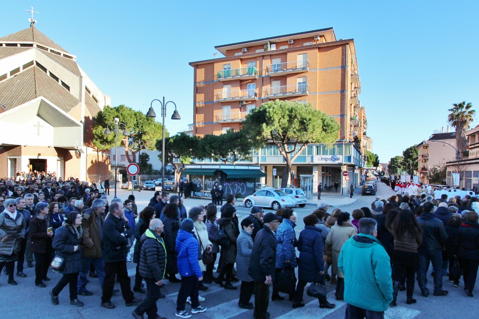 Con questo spirito di raccoglimenti molte persone provenienti da tutte le parrocchie della Vicaria si sono radunate, nel pomeriggio di ieri, presso la chiesa San Filippo Neri in San Benedetto del Tronto, per procedere processionalmente col Vescovo, i sacerdoti, i religiosi, le confraternite, dietro la croce per le vie della città, cantando salmi e litanie.