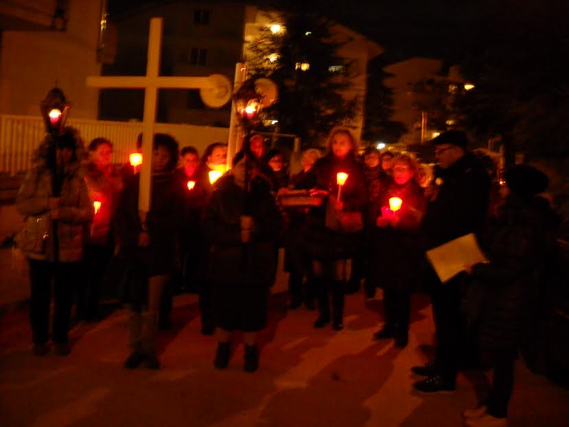 ACQUAVIVA PICENA – Ad Acquaviva Picena quest’anno tutti i venerdì di Quaresima il pio esercizio della Via Crucis si svolgerà lungo le strade delle zone più periferiche del paese a partire dalle ore 21:00. “Via Crucis Via di Misericordia” sarà il tema conduttore per i venerdì di Quaresima 2016, su invito di Papa Francesco per questo Anno Santo. Le quattordici Stazioni della Via Crucis ad Acquaviva sono state intervallate dai passi del Vangelo, dalla meditazione, dalle preghiere e dai canti. Lungo le vie, per accogliere la processione, sono stati posti dei lumini accesi e le abitazioni hanno acceso le luci fuori casa. Don Alfredo ha voluto iniziare dalla zona compresa tra le vie: Mazzini, Cavour e Garibaldi per poi nei prossimi venerdì, proseguire nelle zone sempre più lontane dal centro storico di modo che tutti gli acquavivani, anche quelli che risiedono più lontano dalla parrocchia, si sentano coinvolti e più agevolati a partecipare.