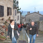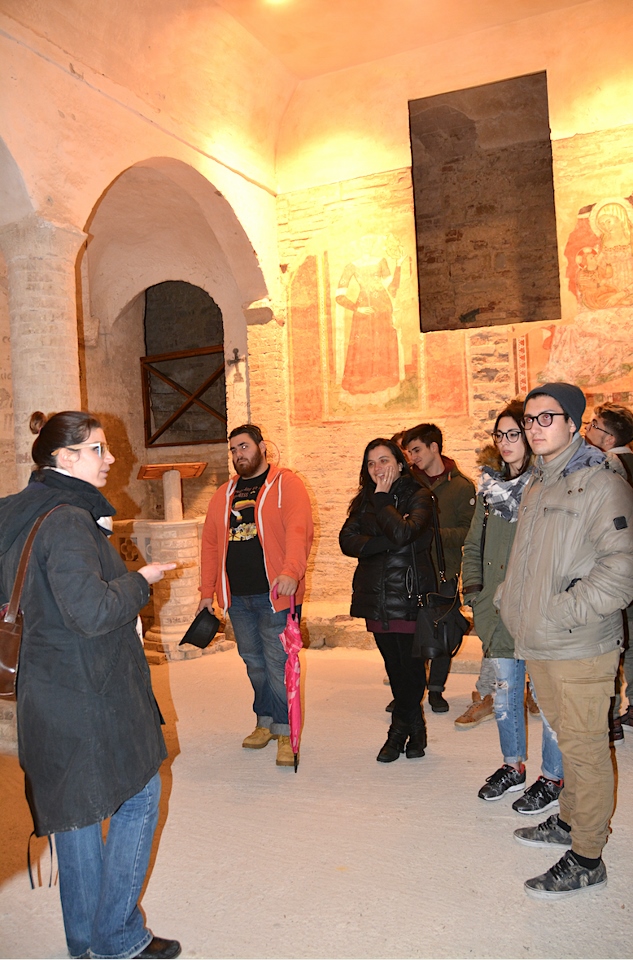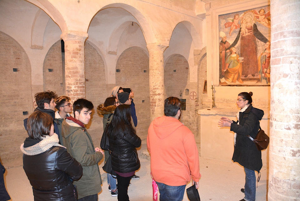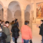 La dottoressa Ferracuti ha illustrato gli aspetti artistici, culturali e storici di molte Chiese Montelparesi a iniziare da quella di S. Agostino con l’annesso Convento. Si passava quindi alla Chiesa di San Gregorio Magno, edificata nel 1615 dal Cardinale Montelparese Gregorio Petrocchini (Camerlengo di Papa Sisto Quinto). Da qui si raggiungeva, salendo attraverso la Via Castello, la Chiesa principale del paese: San Michele Arcangelo. Qui, dopo un’esauriente e impareggiabile spiegazione, si scendeva nella Cripta sottostante l’altare maggiore. Negli occhi di ognuno si leggeva una grande meraviglia e tanta emozione per ciò che si stava vedendo e che, forse, nessuno si aspettava di vedere!