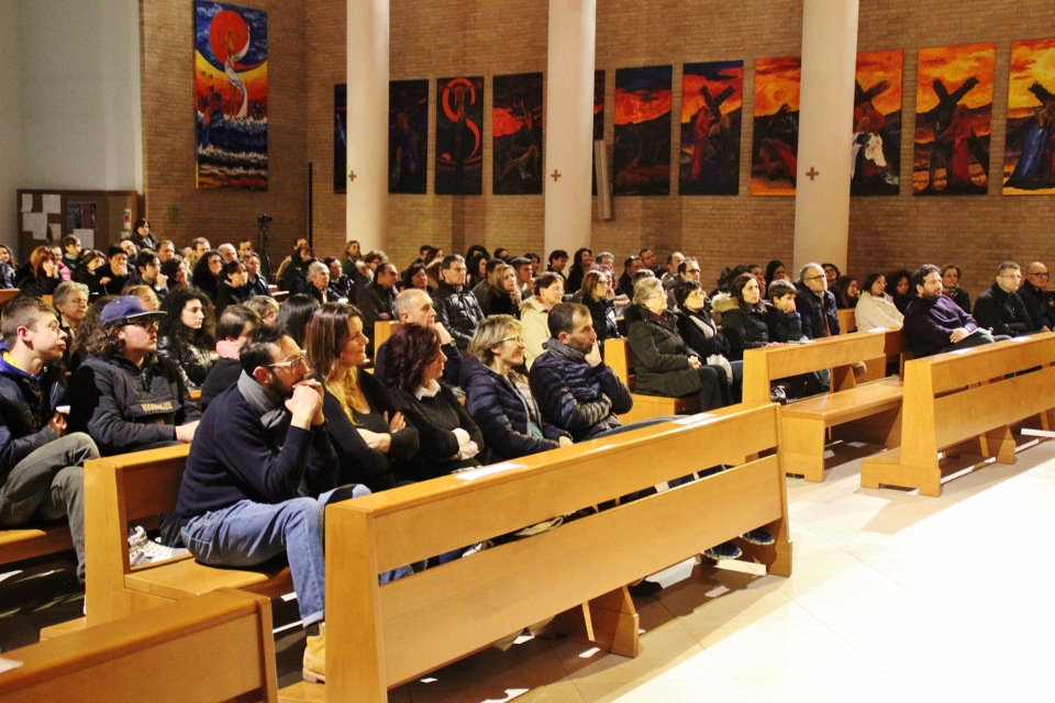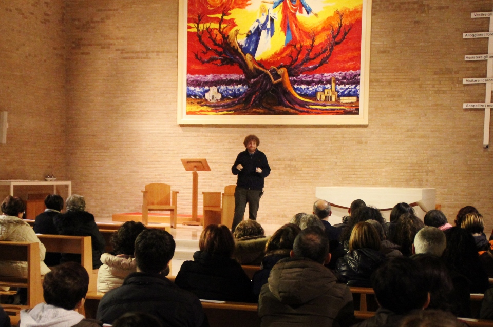 GROTTAMMARE – Alessandro Sortino, giornalista e direttore creativo di TV2000, ma tutti continuano a ricordargli che era una delle Iene sebbene da molto tempo non vesta più quei panni, ha parlato di misericordia presso la chiesa “Madonna della Speranza” di Grottammare. Ha introdotto la sua riflessione proprio dall’esperienza delle Iene, ricordando che uno dei motivi per cui ha scelto di fare il suo lavoro è nato dalla lettura di Renè Girard sul concetto di capro espiatorio. Ha presentato la società oggi con un’immagine: quella di un castello dove si sta bene, si fa festa e si banchetta, e fuori coloro che non hanno accesso a questo banchetto. Ma i partecipanti al ricco banchetto non sanno che a qualcuno di loro a rotazione toccherà essere buttato fuori in pasto a quelli che stanno fuori, capro espiatorio appunto, ma anche quella cultura dello scarto di cui parla papa Francesco.