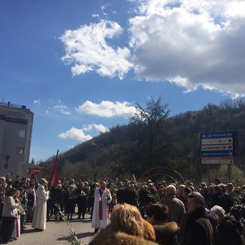 È la domenica della benedizione e dello scambio del piccolo ramo di ulivo, una pianta che, dice Don Dino Straccia, parroco della comunità Comunanzese “cresce nei luoghi un po’ più aridi, ma che è ricca di vita e nutrimento, capace per questo di offrire un segno di speranza anche nei luoghi più isolati. Un gesto, quello della benedizione del ramoscello, che per noi deve avere anche il senso di un atto di fede per il quale sentiamo che la presenza di Dio porta vita nuova nella storia dell’umanità”. Al termine della celebrazione Don Dino ha ricordato che “questa Settimana Santa è il “cuore” di tutto l’anno liturgico, perché ci ripresenta ed attualizza il mistero pasquale, cioè la passione, la morte e la risurrezione del Signore. È una settimana che va vissuta con intensità, con preghiera e con raccoglimento. Quest’anno siamo favoriti anche dal Giubileo della misericordia indetto da Papa Francesco. Don Dino ha ricordato che proprio domenica 13 marzo, la Vicaria della Beata Assunta Pallotta che comprende anche la parrocchia di Comunanza ha varcato la soglia della Porta Santa della Cattedrale di San Benedetto del Tronto, avvicinandosi al Sacramento della penitenza affinché sia un atto di vera conversione. Ricordiamoci ha concluso il Vicario che Papa Francesco ci ha fatto un grande dono, e saremmo dei superficiali se non ne usufruissimo a piene mani.