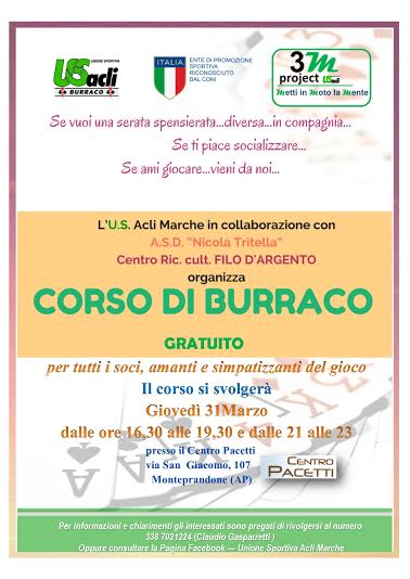 MONTEPRANDONE – Sono aperte le iscrizioni al corso gratuito di burraco in programma per giovedì 31 marzo presso il Centro Pacetti. L’iniziativa è promossa dall’Unione Sportiva Acli Marche in collaborazione con l’A.S.D. “Nicola Tritella” e con il Circolo ricreativo culturale Filo d’Argento. L’iniziativa si svolgerà dalle ore 16,30 alle ore 19,30 e dalle ore 21 alle ore 23.