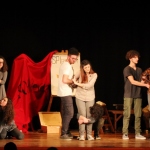 Michele: “Abbiamo infatti cercato di lavorare molto sul trasporto emozionale, di fare un lavoro esperienziale che non si basasse solo sulla semplice battuta ma che coinvolgesse il pubblico soprattutto dal punto di vista emotivo, cercando di comunicare dei messaggi non solo verbalmente ma anche visivamente, con dei momenti per esempio soltanto musicali. Sin da subito, poi, i ragazzi di Centobuchi hanno accolto questo modus operandi con entusiasmo e tra noi c’è stato un continuo scambio di idee: noi abbiamo messo un po’ della nostra esperienza e loro tanta spontaneità.