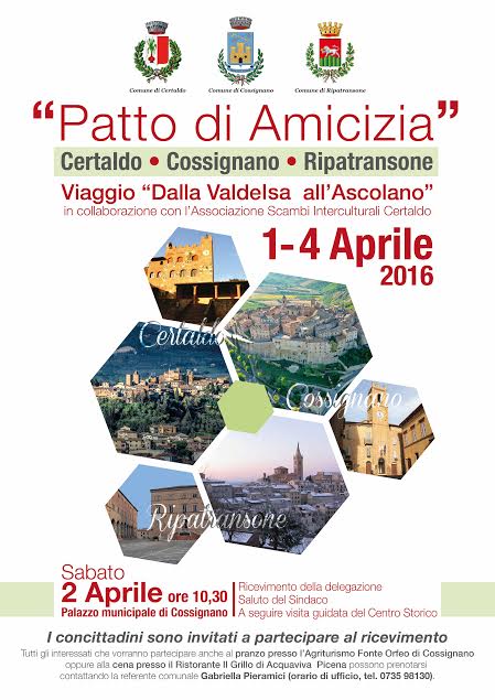 In collaborazione con l’Associazione Scambi Interculturali Certaldo, gli attuali Sindaci, Giacomo Cucini di Certaldo, Remo Bruni di Ripatransone e Roberto De Angelis di Cossignano, nell’intento di proseguire nel consolidamento durevole delle relazioni esistenti, hanno organizzato il rinnovo del “Patto di amicizia” nel primo week end del mese di aprile, quando una numerosa delegazione di Certaldo, composta da amministratori e da tanti amici della cittadina del Boccaccio, originari marchigiani e non, farà visita ai territori di Cossignano e di Ripatransone.