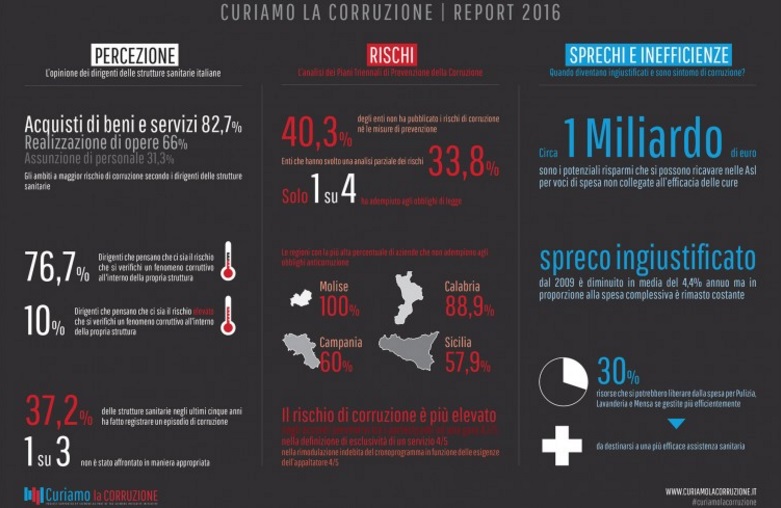 Il rapporto spiega con efficacia che le voci di spesa per beni e servizi che non incidono direttamente sull’assistenza sanitaria e non sono collegati all’efficacia dell’intervento, come quelle per la mensa, la lavanderia e la gestione dei rifiuti speciali, assorbono risorse consistenti. Voci apparentemente minori, che costituiscono l’1,5% della spesa sanitaria nazionale, ma dove nei fatti si annidano spreco e corruzione per ben un 29% di spese ingiustificate. Dall’analisi dei conti di Asl e Aziende ospedaliere emerge che dal 2009 al 2013 gli sprechi sono diminuiti in media del 4,4% l’anno, ma la loro incidenza rispetto alla spesa complessiva non si è ridotta: ammontano a 1 miliardo di euro l’anno. Il rapporto informa inoltre che molto è stato fatto per prevenire i casi di corruzione in ambito sanitario. Il 97% delle strutture sanitarie ha adottato uno specifico Codice di comportamento dei dipendenti, il 93% ha predisposto un regolamento per le procedure d’acquisto e l’85% ha previsto procedure per la segnalazione di casi di corruzione e azioni a tutela dei dipendenti che le effettuano (i whistleblower). Ma l’esame dei Piani anticorruzione, previsti dalla L. 190/2012, rivela però che nel 40% dei casi ci si è limitati a un adempimento formale dell’obbligo di legge.