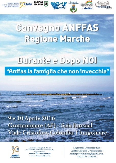 A riprova di questo Anffas Regione Marche ha inteso organizzare, in collaborazione con Anffas Onlus Nazionale, Fondazione Nazionale Anffas “Dopo di Noi” e Consorzio “La rosa blu” presso la città di Grottammare un Convegno dal Titolo “Durante e Dopo NOI Anffas la Famiglia che non invecchia” per il prossimo 9 e 10 Aprile.
