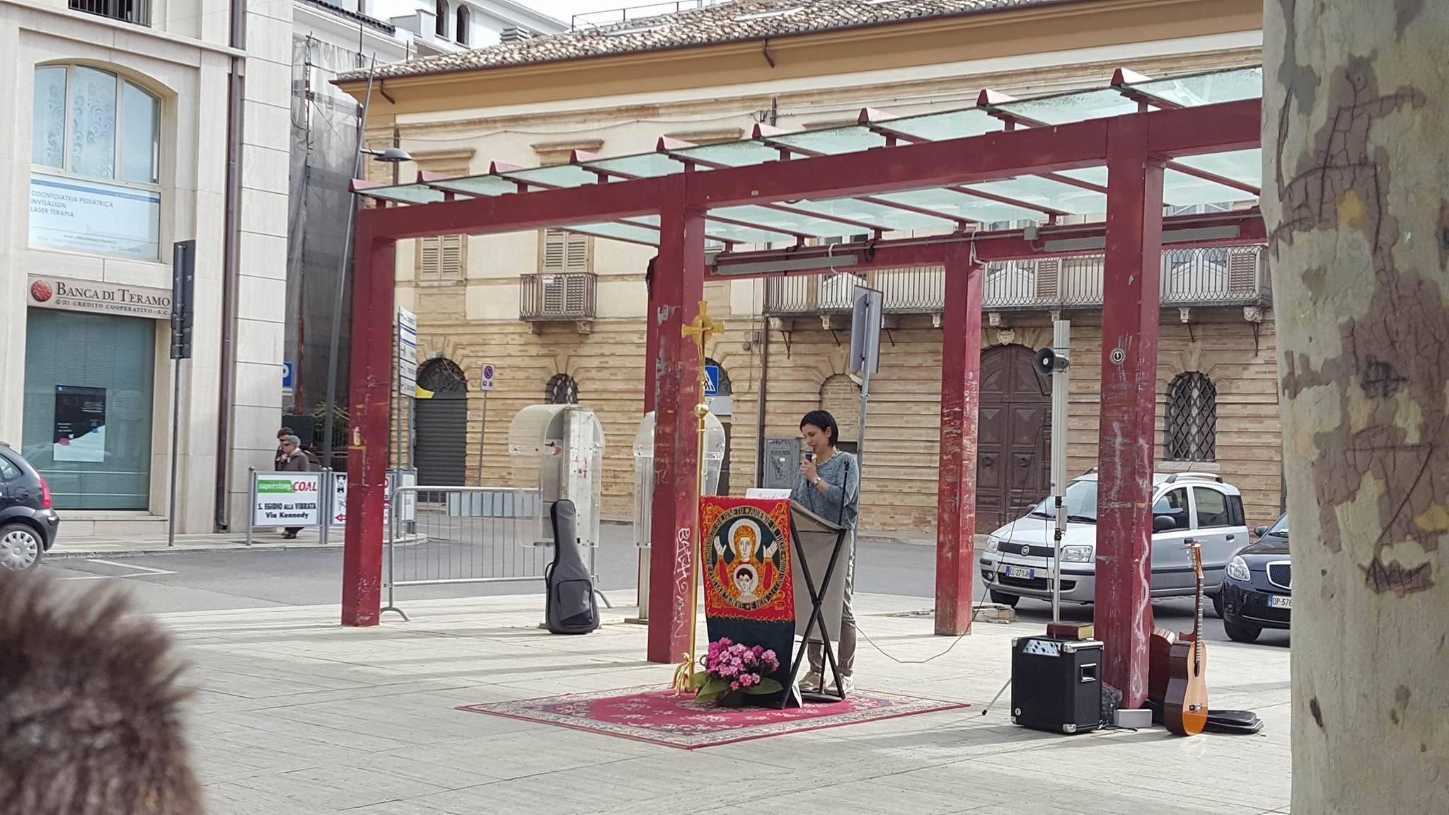 SANT’EGIDIO ALLA VIBRATA – Giornata neocatecumenale a Sant’Egidio alla Vibrata: nel caldo pomeriggio di domenica 17 aprile, infatti, le comunità del cammino si sono ritrovate in piazza Umberto I per la seconda giornata dedicata ad una missione che coinvolge 100 piazze tra Abruzzo e Marche. Lo scopo è evangelizzare attraverso la Parola e la testimonianza: la fede, infatti, ha origine dall’ascolto e in questa secondo incontro a fare testimonianza è stata Sonia, una signora di 35 anni, madre di 4 figlie ma anche di altri 4 figli oggi in cielo.