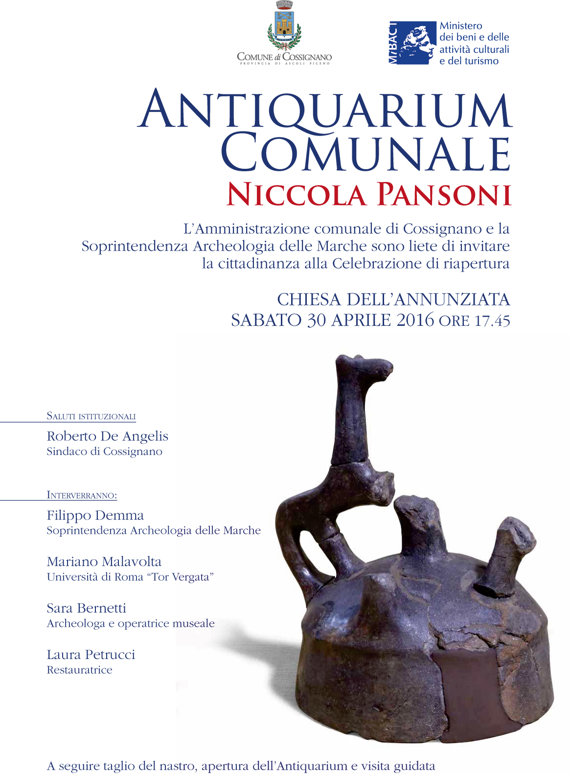 COSSIGNANO – Sabato 30 aprile 2016, alle ore 17.45, verrà celebrata la riapertura dell’Antiquarium comunale intitolato a Niccola Pansoni (1882- 1932), cultore di storia locale e poeta nel vernacolo.