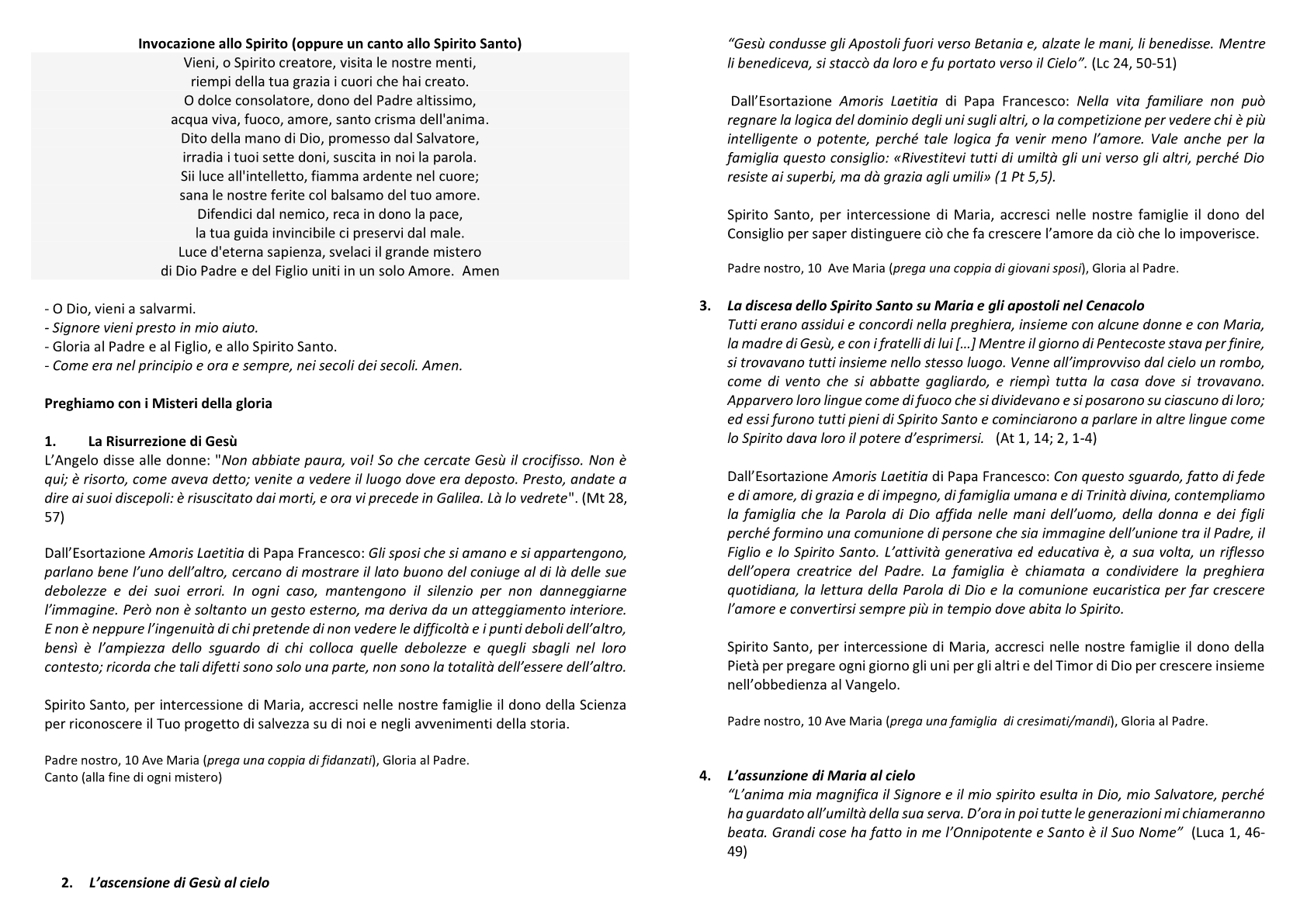 - GIOVANNI PAOLO II nella lettera “Rosarium Virginis Marie” diceva: “il Rosario è anche, da sempre, preghiera della famiglia e per la famiglia. Un tempo questa preghiera era particolarmente cara alle famiglie cristiane, e certamente ne favoriva la comunione. Occorre non disperdere questa preziosa eredità. Bisogna tornare a pregare in famiglia e a pregare per le famiglie, utilizzando ancora questa forma di preghiera…La famiglia che recita insieme il Rosario riproduce un po’ il clima della Casa di Nazareth: si pone Gesù al Centro, si condividono con lui gioie e dolori, si mettono nelle sue mani bisogni e progetti, si attingono da lui la speranza e la forza per il cammino”.