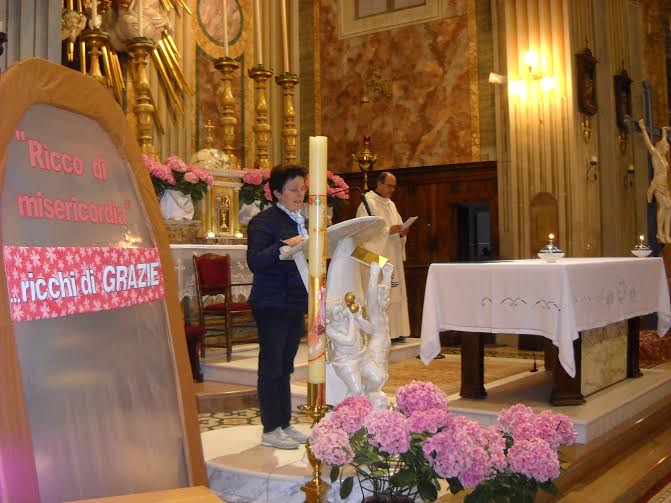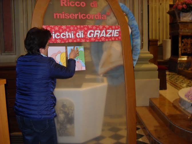 I due gruppi parrocchiali, per fare in modo che rimanessero ben visibili le opere di misericordia, hanno deciso di rappresentare con dei disegni le mani che compiono queste opere. Il Gruppo del Vangelo e la Pastorale Familiare hanno invitato una coppia, Luigi e Rinalda della parrocchia di San Benedetto Martire, che hanno gentilmente accettato di offrire la loro testimonianza. Essi hanno raccontato come è difficile spesso perdonare le persone con chi si è più in contatto, come ad esempio in una famiglia. È più facile con chi si ha minore relazione. Alle coppie hanno consigliato di non essere di peso l’uno per  l’altro, ma anzi di venirsi incontro. Don Alfredo nella sua riflessione ha evidenziato la figura di Santa Caterina e di come ella abbia sopportato e perdonato continuamente durante tutta la sua vita. Figura da imitare.
