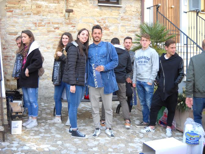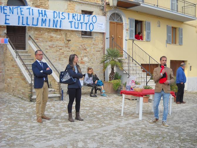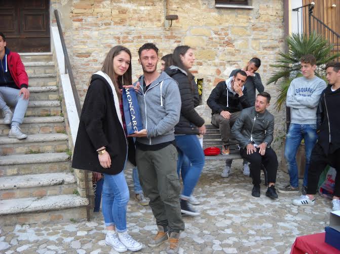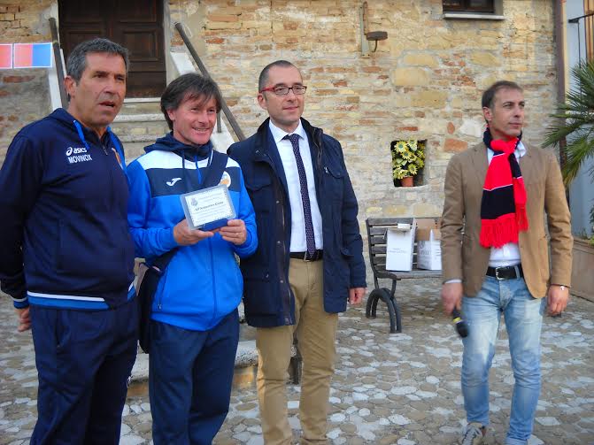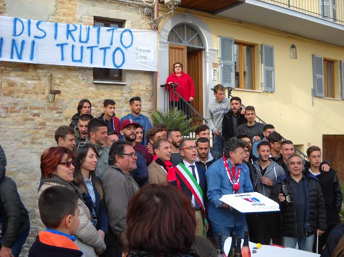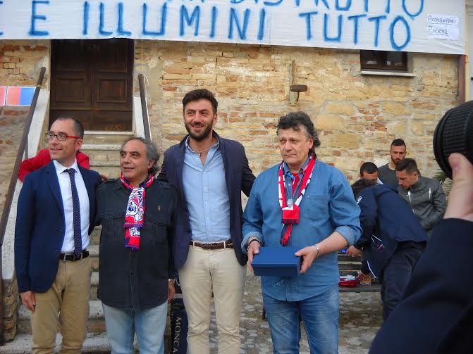 Dopo la partita, tutti sono stati invitati al ricco buffet organizzato ai piedi del Mastio in piazza del Forte. La piazza era piena di striscioni e bandiere in onore della Samb, canti da tifoseria e inno nazionale. Il vice sindaco Balletta ha ringraziato prima di tutto il sindaco che ha permesso tale festa e poi tutte le associazioni che hanno lavorato affinché tutto riuscisse al meglio: le due società calcistiche, Pro Loco, Terraviva, Palio del Duca, Gruppo della Carriola, le cantiche Cherri, Moncaro e Capecci che hanno offerto il vino, lo spumante Pepi Aliventi e Troli Cristano, il ristorante “1941” che ha offerto la pizza, il forno Camela che ha anch’egli offerto la pizza, il forno Massicci-Vulpiani che ha offerto i dolci e preparato e offerto la torta con lo stemma della Samb. Un grazie anche ai due ex giocatori della Samb: Sebastiano Vecchiola e Troli Cristano. Ha ringraziato anche i mister: della Samb Ottavio Palladini e dell’Acquaviva calcio seconda categoria Luigi Travaglini. Poi la parola è passata al sindaco Rosetti che ha detto: “Ho notato che i bambini vi guardavano mentre eravate in campo e che erano più attenti di noi adulti. Cercate sempre di essere un buon esempio di virtù e lealtà per loro, ricordandovi che lo sport unisce e non divide, và oltre ogni barriera”. Dopodiché anche l’assessore Rossi ha salutato e ringraziato tutti i presenti. Non è mancato il taglio della torta con su lo stemma della Samb e il brindisi con lo spumante. Il vice sindaco ha poi voluto premiare con una bottiglia di vino, consegnata dalle ragazze di Acquaviva Alessia, Erika e Giulia, tutti i calciatori delle due squadre e i presidenti delle associazioni. Con una targa, invece, ha premiato gli allenatori e i presidenti.