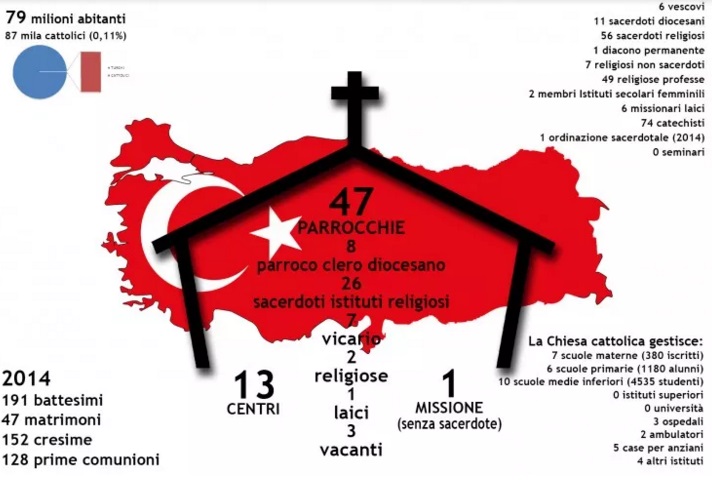 Su oltre 79 milioni di abitanti, i cattolici turchi sono, secondo l’ultimo annuario statistico della Chiesa cattolica (2014), appena 87mila (0,11%) suddivisi in 7 diocesi, 47 parrocchie, una missione senza sacerdote e 13 altri centri. Di queste 47 parrocchie, 8 sono guidate da un parroco del clero diocesano, 26 da sacerdoti appartenenti a istituti religiosi, 7 amministrate da un vicario, due affidate a religiose, una a dei laici e tre totalmente vacanti. Una piccola Chiesa guidata da sei vescovi, 11 sacerdoti diocesani, 56 quelli religiosi, un diacono permanente, 7 religiosi non sacerdoti, 49 religiose professe, due membri di Istituti secolari femminili, 6 missionari laici e 74 catechisti. Nel 2014 la Chiesa turca ha celebrato una sola ordinazione sacerdotale, dopo tre anni di vuoto. Nel Paese della Mezzaluna la Chiesa cattolica non ha seminari e scuole dove gli attuali sei candidati al sacerdozio possono formarsi.