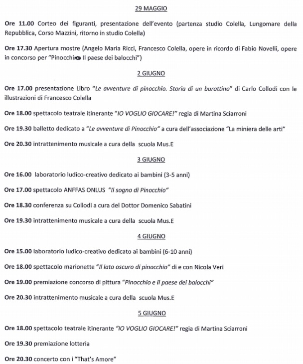 L’evento si presenterà sin dalle sue prime battute come una vera grande festa rivolta ai bambini, bambini di tutte le età. Sarà infatti una parata accompagnata da banda musicale e figuranti che attraverserà le vie del centro di Grottammare a dare il via, domenica 29 maggio, a il “Paese dei Balocchi”. La manifestazione si sposterà poi il 2, il 3, il 4 e il 5 giugno nel vecchio incasato della città con tante attività e un unico filo conduttore, Pinocchio. Musica, laboratori artistici, spettacoli teatrali, mostre, pesche, intrattenimento di strada, balletti e approfondimenti sull’opera di Collodi animeranno i vicoli di uno dei più suggestivi borghi d’Italia.