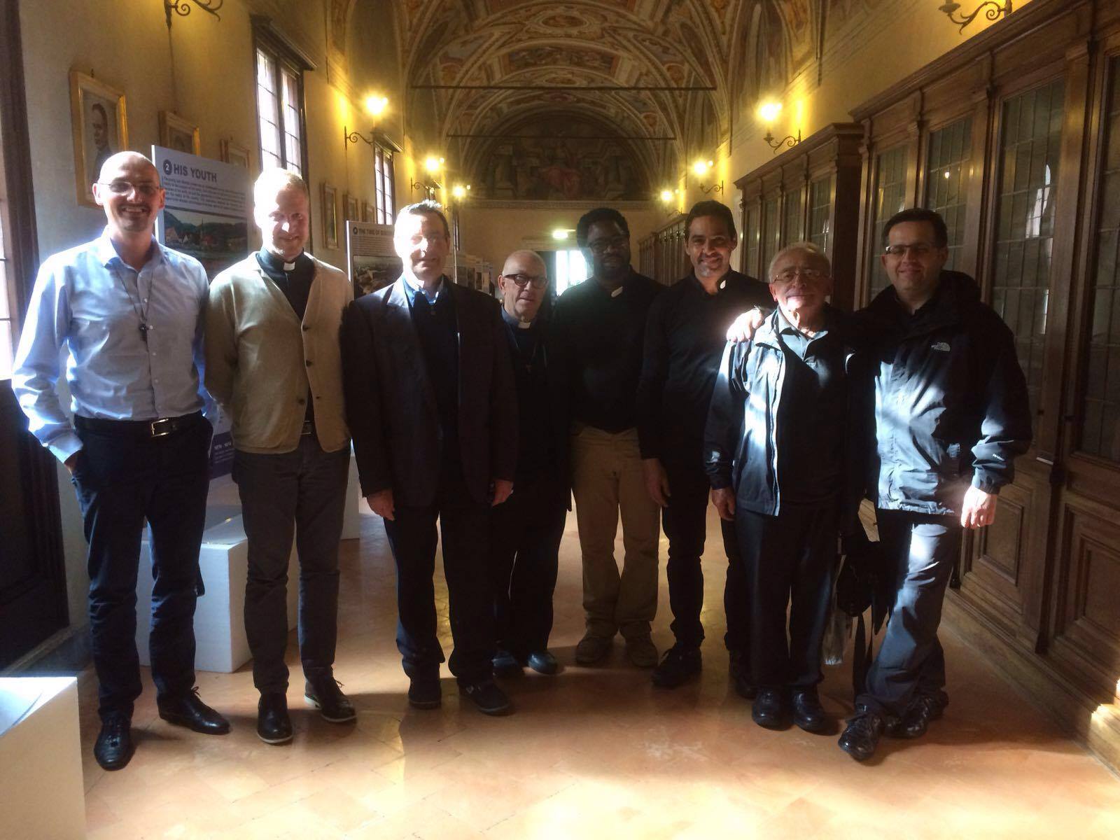 Partiti da Castignano di buon mattino, approfittando della generosa e puntuale organizzazione della Parrocchia di San Pietro Apostolo e del Parroco don Tiziano Napoletani, sette dei dieci Presbiteri delle Parrocchie della collina e dell’entroterra montano marchigiano, si sono messi in marcia verso Roma, condividendo preghiera e chilometri. Arrivati su Via della Conciliazione, la graditissima e squisita ospitalità dei Padri Salvatoriani si è subita prodigata per accogliere il piccolo gruppo sacerdotale. Il Padre Generale della Congregazione ha salutato ciascuno e ha accompagnato i pellegrini sulla tomba del Padre Fondatore, il Servo di Dio Francesco Maria della Croce Jordan. Fu questo sacerdote tedesco a maturare la decisione di istituire una Congregazione missionaria per la difesa e la diffusione della Fede cattolica tra i non cristiani e ricevette in tal senso l’incoraggiamento del Cardinale cappuccino Guglielmo Massaia. La Cerimonia di Fondazione si tenne l’8 dicembre 1881 nella Chiesa di Santa Brigida a Roma e la sede della Congregazione, nel 1883, venne stabilita presso Palazzo Cesi.
