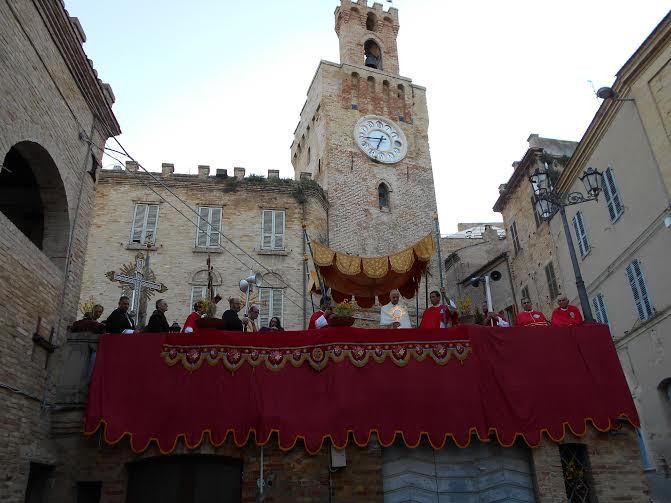 Si è snodata poi, la solenne processione con il Santissimo Sacramento. Presenti tutte le confraternite e i bambini che hanno ricevuto la Prima Comunione, presente l’amm.ne comunale a cominciare dal sindaco Rosetti e il vice sindaco Balletta, presente il maresciallo Petruzzi e il Comandante del Corpo di polizia locale dell’Unione Scarfini, presenti anche molte forze dell’ordine e la protezione civile, impegnati nella viabilità durante lo svolgimento della processione, presente anche la banda musicale cittadina. Durante il percorso si sono fatte delle soste dove erano presenti altarini preparati dagli abitanti dei rispettivi quartieri attraversati. Durante la solenne processione sono stati eseguiti sia canti che pezzi strumentali. La processione è terminata sulla terrazza del “dopolavoro” in piazza san Niccolò. Dopo la benedizione eucaristica tutti sono stati invitati ad entrare in chiesa dove si è eseguita una canzone dedicata alla Madonna.