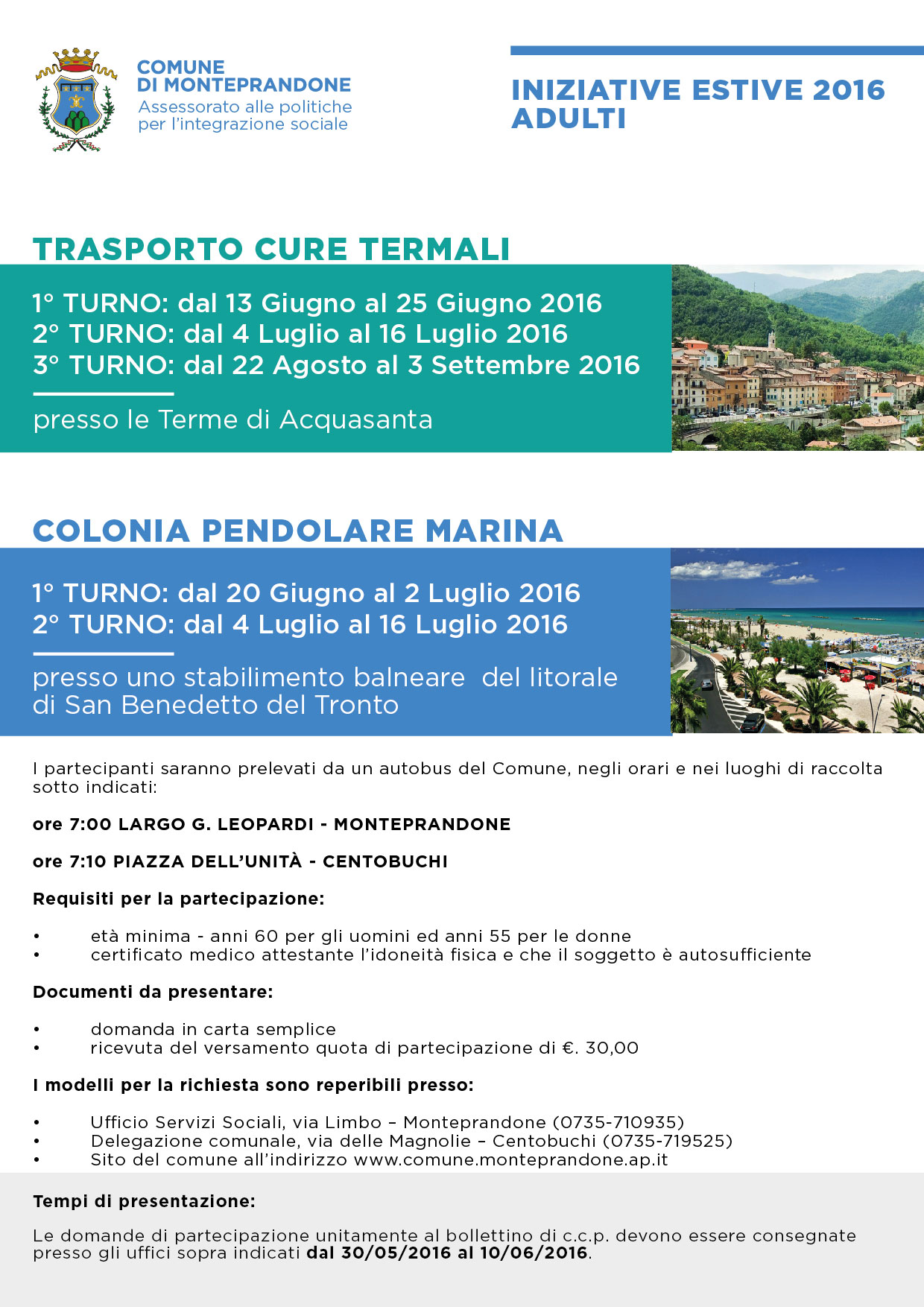 In particolare, per gli adulti è previsto un servizio di trasporto presso le Terme di Acquasanta distribuito in 3 turni (uno a giugno, uno a luglio e uno ad agosto) oltre ad un servizio di colonia pendolare marina presso uno stabilimento balneare del litorale di San Benedetto del Tronto nei periodi che vanno dal 20 giugno al 2 luglio e dal 4 luglio al 16 luglio prossimi.