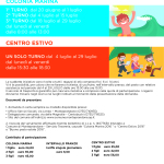 Per i ragazzi compresi tra i 6 e i 14 anni sarà attivo, invece, un Centro Estivo aperto dal 4 al 29 luglio (dal lunedì al venerdì dalle 15.30 alle 18,30) e un servizio di colonia marina dal lunedì al venerdì (dalle ore 8.00 alle ore 13.00) diviso in tre turni: dal 20 giugno al 1 luglio, dal 4 al 15 luglio e dal 18 al 29 luglio.