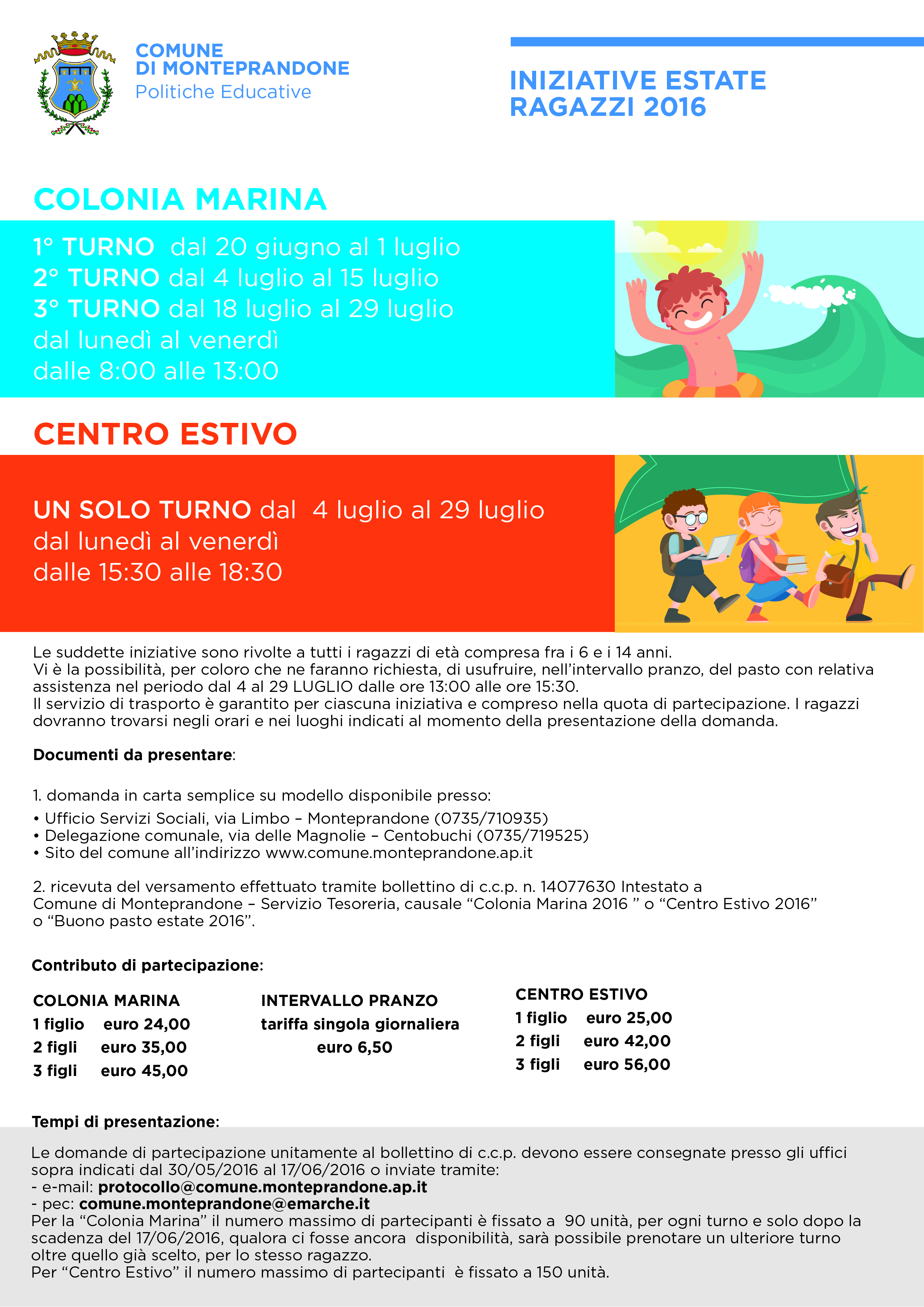 I contributi di partecipazione per la colonia marina e per il centro estivo sono i seguenti:
