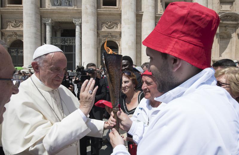 Con queste parole Papa Francesco ha benedetto la Fiaccola della Pace del 38° Pellegrinaggio, questa mattina in Piazza S. Pietro, dalle mani del giovane tedoforo di Fermo, Daniele Cipolletta.