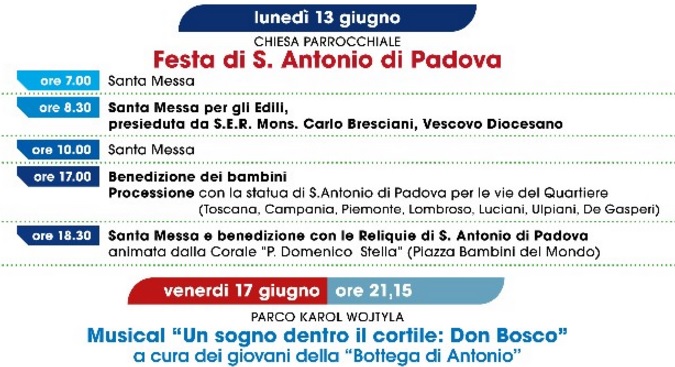 Redazione 9 anni ago Oggi la festa di Sant’Antonio di Padova HomepageSan Benedetto del tronto SAN BENEDETTO DEL TRONTO – Si terrà oggi presso la Parrocchia Sant’Antonio di Padova in San Benedetto del Tronto un ricco programma di festa in onore del Santo Patrono. Il programma "Tra il cielo e il mare" mostra fotografica di Giuseppe Palestini » « Agenda Pastorale del Vescovo Carlo Bresciani Categories: Notizie Diocesi Porto d'Ascoli San Benedetto del tronto Redazione: Leave a Comment Related Post Il giovane Emanuele Sebastiani: “È bello donare la vita a servizio di Dio e della Chiesa” La Caritas di San Benedetto invita a due gesti concreti di carità: per le Filippine e per i più poveri delle nostre città Intervista ad Alessia Di Quirico, il soprano sambenedettese che conquista il pubblico internazionale