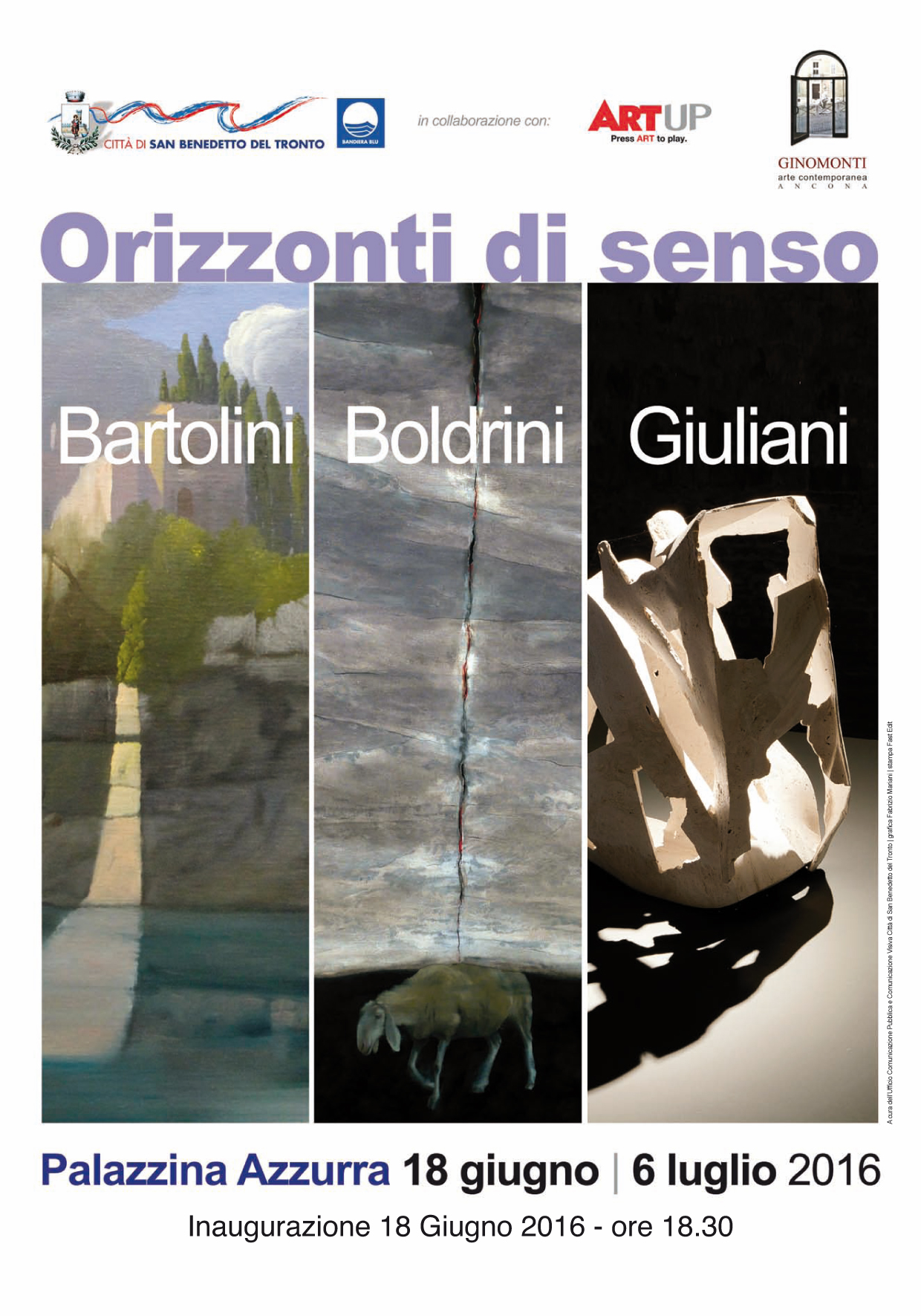 SAN BENEDETTO DEL TRONTO – Dal 18 giugno al 6 luglio, la Palazzina azzurra di San Benedetto del Tronto ospita la mostra “Orizzonti di senso. Bartolini Boldrini Giuliani”.