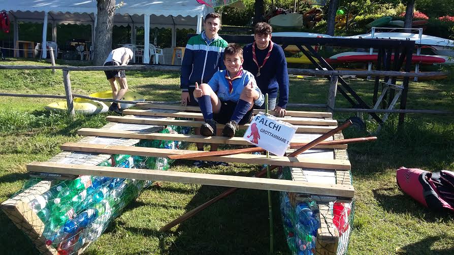Invece i Falchi, pur non vincendo, hanno gareggiato con un catamarano fatto di bottiglie riciclate .