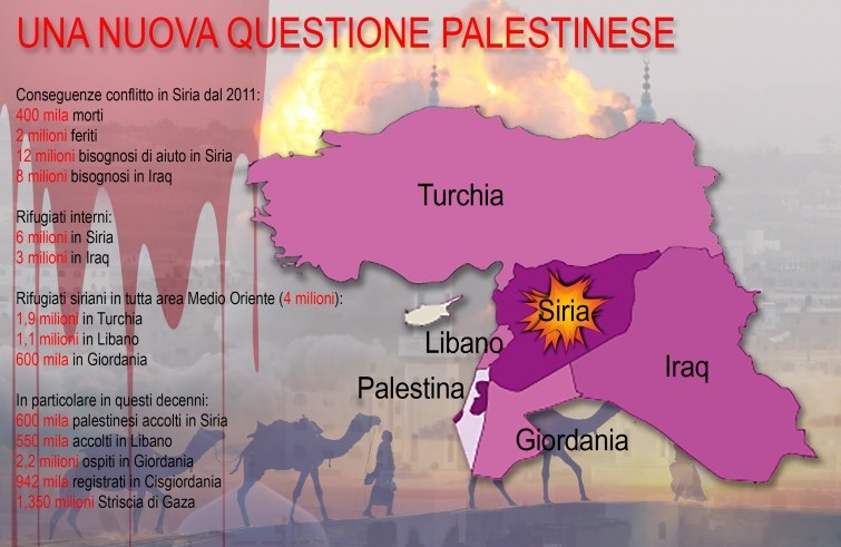 Siriani e iracheni, nuovi palestinesi. Secondo i dati disponibili, e riportati nel corso di una recente riunione del Pontificio Consiglio Cor Unum, dal 2011 il conflitto in Siria avrebbe provocato finora circa 400 mila vittime e 2 milioni di feriti.Attualmente sono più di 12 milioni le persone bisognose di aiuto in Siria e oltre 8 milioni in Iraq;i rifugiati interni sono più di 6 milioni in Siria e più di 3 milioni in Iraq, mentre almeno 4 milioni sono i rifugiati siriani in tutta l’area del Medio Oriente: in particolare, 1,9 milioni in Turchia, 1,1 milione in Libano, più di 600mila in Giordania.Pezzi di popolo senza patria così come lo sono i 600mila palestinesi accolti in questi decenni in Siria, i 550mila in Libano, i 2,2 milioni ospiti della Giordania, oltre ai 942mila registrati in Cisgiordania e al milione e 350mila della Striscia di Gaza.I dati Onu non tengono conto di tutti i palestinesi residenti nei Territori (dunque non registrati come rifugiati) e di quelli che negli anni passati sono emigrati in diversi Paesi del mondo, in particolare in Sud America. Una crisi ormai “datata” quella palestinese, per anni uno dei cavalli di battaglia dei movimenti radicalisti islamici, ora abbandonata a favore di una più efficace – almeno sul piano mediatico – jihad globale.