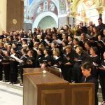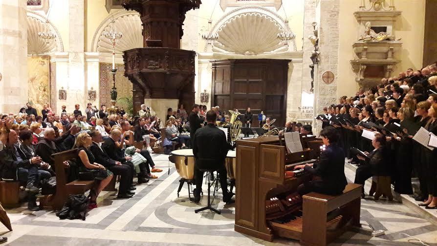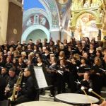 Il concerto si è aperto con il Pompadour Brass Quintet che ha eseguito magistralmente musiche di Hendel, Charpentier, Purcell, Haydn, Clarke, Mouré. Quindi la suggestione è proseguita, quando 200 elementi di ben sei cori: il Coro “Ventidio Basso” di Ascoli Piceno e le Corali Cappella Musicale Cattedrale e “P. Domenico Stella” di San Benedetto del Tronto, la corale “Le Ville” di Castel di Lama e le corali “Sisto V” di Grottammare e “Madonna di San Giovanni” di Ripatransone, hanno raggiunto l’altare maggiore intonando le arie maestose della Missa Brevis di Jacob De Haan.