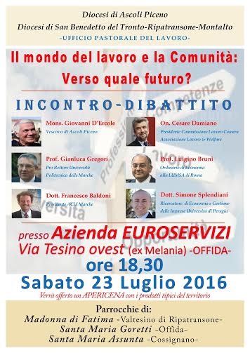 DIOCESI – Le Diocesi di Ascoli Piceno e di San Benedetto del Tronto – Ripatransone – Montalto grazie all’impegno dei rispettivi Ufficio di Pastorale del Lavoro e con il supporto delle Parrocchie di Santa Maria Goretti di Offida, Madonna di Fatima della Valtesino di Ripatransone e della Chiesa Santa Maria Assunta di Cossignano organizzano per sabato 23 Luglio alle ore 18.30 un convegno/dibattito con tema: “Il mondo del lavoro e la Comunità, verso quale futuro?”.