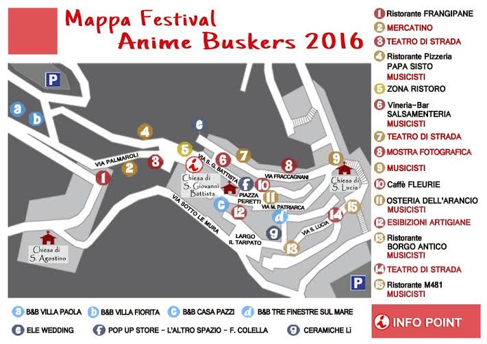 Sono confermati la mostra fotografica e il teatro di strada e nella serata di chiusura, il 24 Luglio, la jam session in cui tutti i musicisti si uniranno per salutare la città a suon di musica. Non mancheranno il sempre più ricco e colorato Anime Buskers Market, ricercato mercatino dell’artigianato e di riuso creativo, ed esibizioni live di arte artigiana.