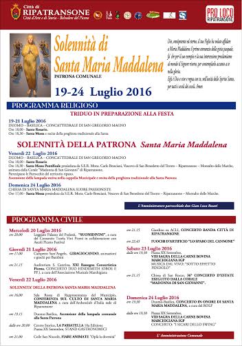 Venerdì 22 luglio: ore 16,00 nella Sala Rossa di Rappresentanza del Municipio la Conferenza sul culto di Santa Maria Maddalena, a cura dell’Archeoclub d’Italia, sede di Ripatransone; alle 21,15 presso il giardino ex ACLI il concerto della Banda Città di Ripatransone; ore 23,45 spettacolo pirotecnico “Lo sparo del Cannone”.
