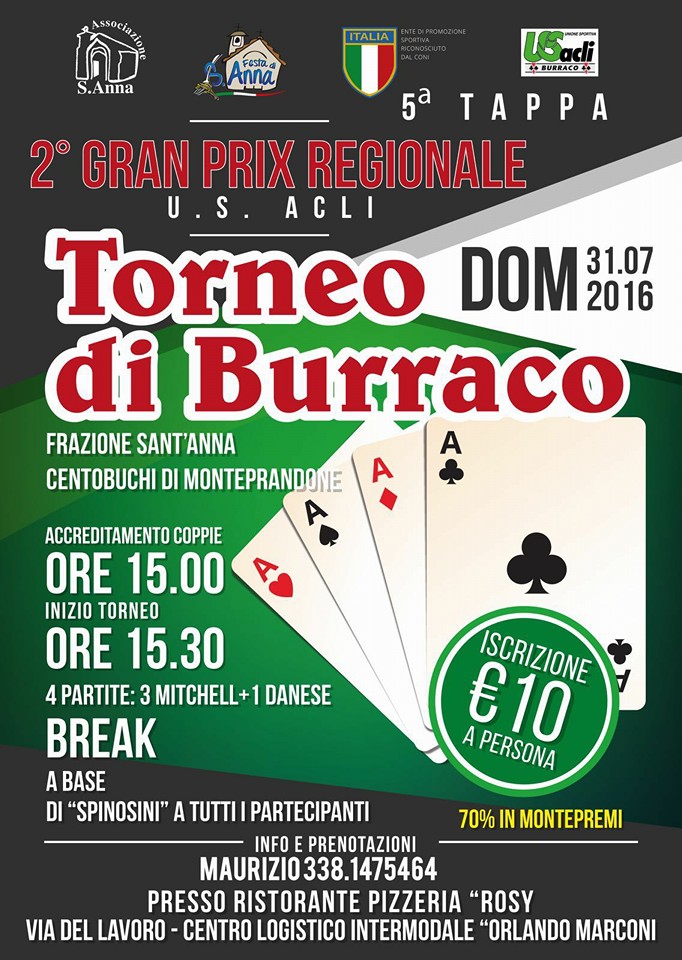 MONTEPRANDONE – Dalla collaborazione tra U.S. Acli Marche ed Associazione Sant’Anna, all’interno del programma dei festeggiamenti della patrona, domenica 31 luglio, a partire dalle ore 15,30 si svolgerà un torneo di burraco.