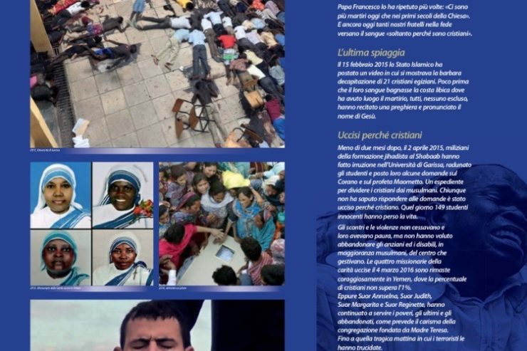 Un titolo che riporta le parole pronunciate da Papa Francesco in un videomessaggio ai cristiani iracheni in occasione del Natale 2014, per un’esposizione che non si limita a raccontare le sole persecuzioni “lontane”, ma anche quelle che hanno luogo, sempre più spesso, a casa nostra. Ecco allora che accanto a stragi come quella accaduta a Lahore in Pakistan nel giorno di Pasqua, sono ricordati massacri avvenuti in Occidente, come quello del Bataclan.