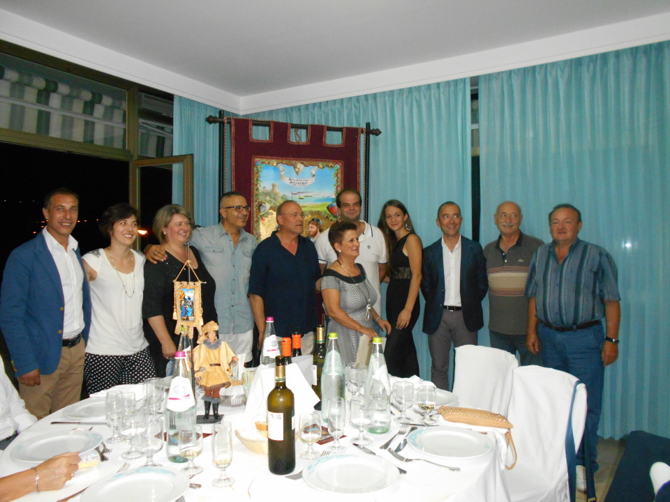 ACQUAVIVA PICENA – Al ristorante “Il Grillo” di Acquaviva Picena è stato presentato il drappo di “Sponsalia 2016”. Presenti alla cena molte persone tra cui tutti i collaboratori e i responsabili dell’associazione Palio del Duca, il sindaco Rosetti e il vice sindaco Balletta, il presidente ass.ne “Terraviva” Gaetani e l’autrice del drappo dott. ssa Emma Fausti, nota principalmente come scultrice. La Fausti, anche nota restauratrice, ha collaborato in moltissime trasmissioni televisive e ha tenuto moltissime mostre. Presente alla serata di presentazione del Drappo anche Saverio Magno, che collabora con l’ass.ne da alcuni anni, sempre alla ricerca di nuovi pittori da far conoscere. Quest’anno ha chiesto alla dott.ssa Fausti, che conosceva soprattutto come scultrice, di collaborare con il Palio del Duca.