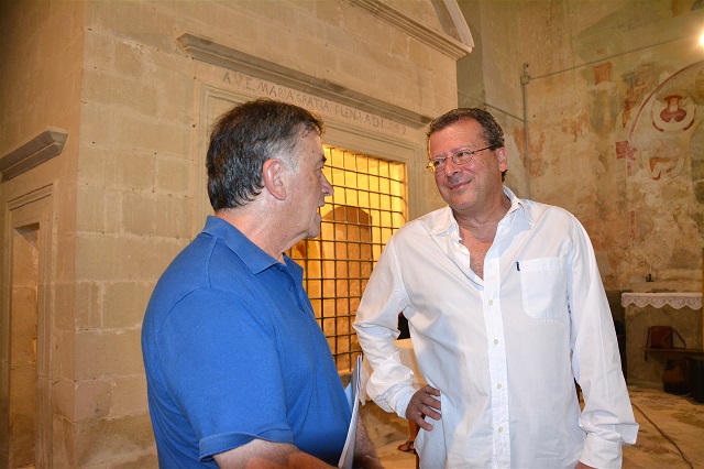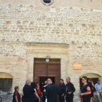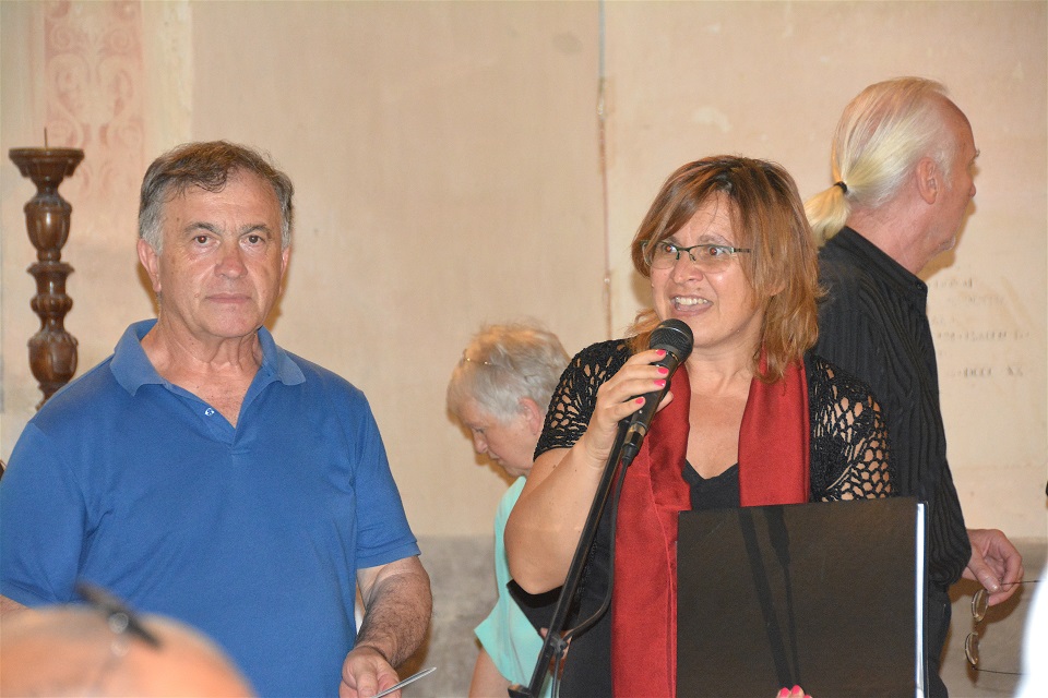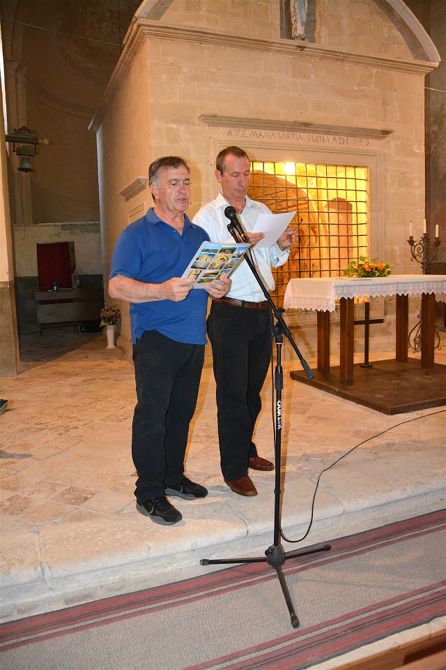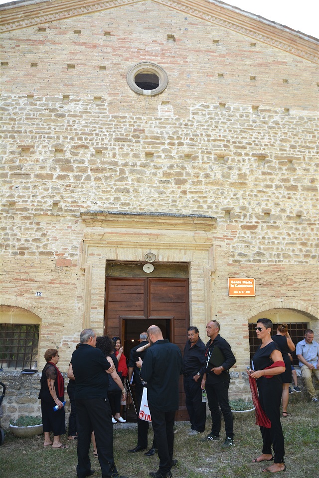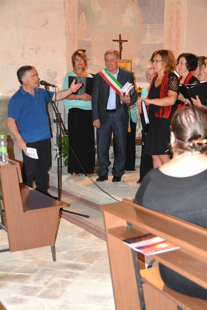 Presentato dal Presidente dell’Associazione Culturale IL MURELLO Giuseppe Mariucci (con traduzione simultanea in inglese effettuata da Ian Mc Carthy), che ha accennato alle origini francescane del monumento (1259 la “pinturetta”-1549 la chiesa), e la presenza essenziale di Paolo Giunta La Spada (per il ricordo di Sidney Seymour Smith assassinato vicino al Santuario dai nazifascisti nel marzo del 1944) l’evento ha avuto un’attenzione massima da tutti i presenti (moltissimi i turisti inglesi residenti da queste parti). Il presidente Mariucci ha, tra l’altro, affermato: “Quando la corale di Montegiorgio mesi fa, parlando con gli amici della corale Petrocchini di Montelparo, propose di effettuare un concerto in una delle tante bellissime e storiche chiese di Montelparo, venne in mente, in considerazione anche della presenza della corale Britannica, che lo scenario più adeguato all’evento fosse proprio questo luogo in cui siamo ora: la Chiesa di Santa Maria in Camurano! La valenza storica e artistica di questo luogo risulta evidente soltanto osservando quanto abbiamo davanti ai nostri occhi! Non voglio appesantirvi e annoiarvi troppo con questioni artistiche, storiche e tecniche visto che siamo qui per ascoltare i meravigliosi canti! Per esse, tra l’altro, servirebbe ben altro che non la mia persona. Voglio solo potervi spiegare le origini del luogo in cui ci troviamo in questo momento.