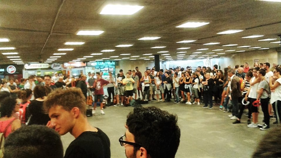 Era prevista in piazza ma hanno dovuto dirottare nella metropolitana causa pioggia. Una bellissima esperienza fatta di testimonianze dei ragazzi,canti e balli.