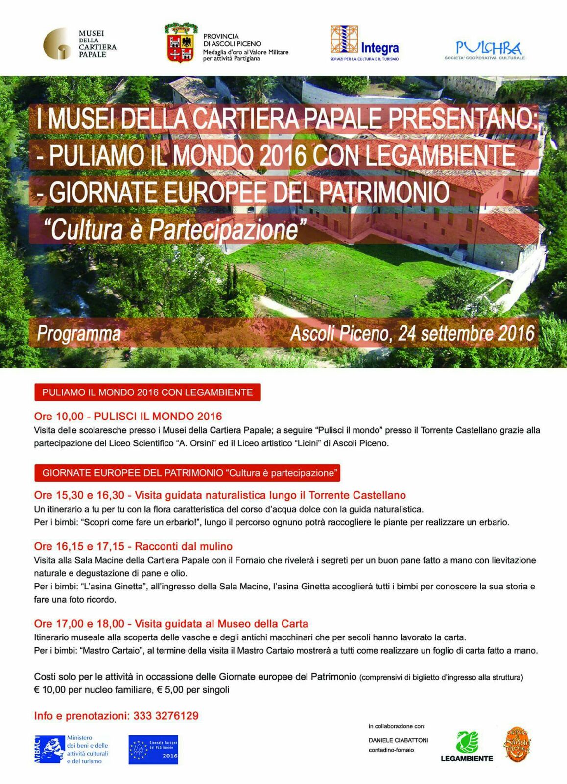 DIOCESI – Oggi sabato 24 settembre la Cartiera Papale sarà al centro di una serie di eventi che abbinano insieme l’iniziativa “Puliamo il mondo 2016 con Legambiente” e le “Giornate Europee del Patrimonio”, all’insegna di cultura e partecipazione. Si comincia al mattino, alle ore 10, con la visita ai musei ospitati nell’antico opificio di alcune classi del Liceo Scientifico “Orsini”, del Liceo Artistico “Licini” e del Istituto “Mazzocchi”, guidate dalla prof.ssa Di Loreto. Quindi le scolaresche parteciperanno alla pulizia di aree limitrofe al Torrente Castellano.