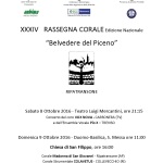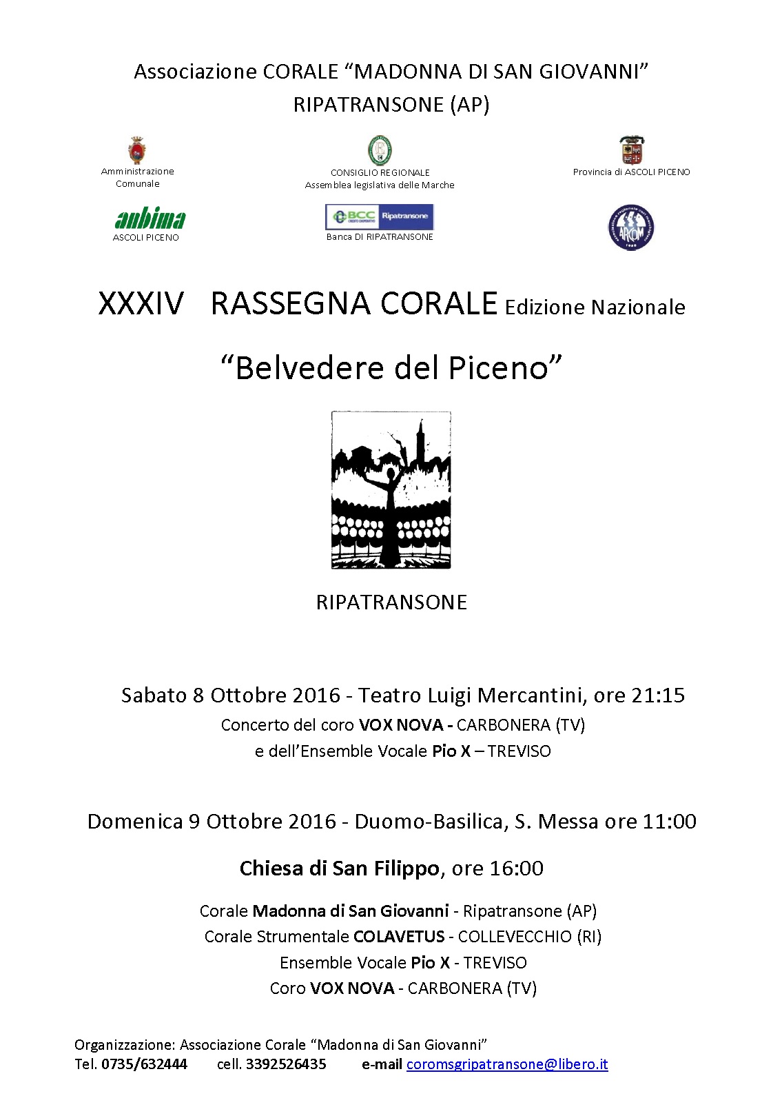 Fervono i preparativi, a Ripatransone, per la XXXIV Rassegna Corale “Belvedere del Piceno” che quest’anno, in Edizione Nazionale, è in programma nei giorni 8 e 9 Ottobre 2016.
