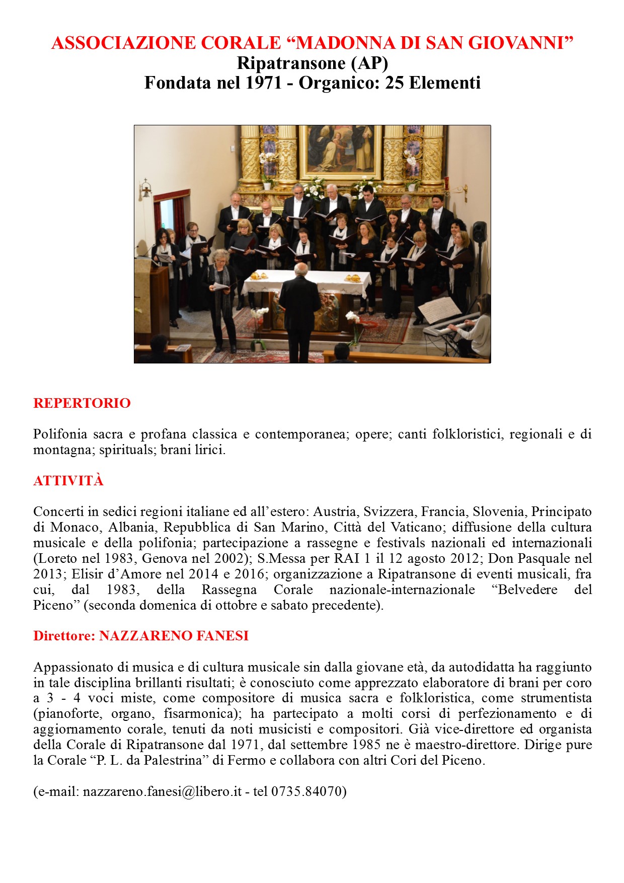 A fare gli onori di casa, come sempre, l’ASSOCIAZIONE CORALE “MADONNA DI SAN GIOVANNI” di Ripatransone, diretta dal Maestro Nazzareno Fanesi, che si esibirà proponendo brani del proprio repertorio di Polifonia sacra e profana classica e contemporanea, opere e brani lirici, canti folkloristici, regionali e di montagna, spirituals che, da sempre, sono alla base della propria intensa attività musicale, ininterrotta da oltre 40 anni (1971) e che ha visto la Corale: