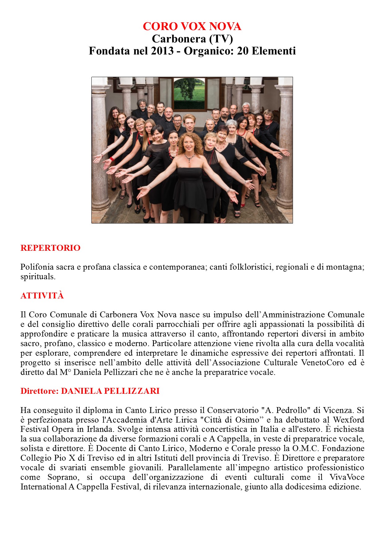 • CORO VOX NOVA di Carbonera (TV), diretto dal Maestro Daniela Pellizzari, che proporrà pezzi tratti dal proprio repertorio fatto di Polifonia sacra e profana classica e contemporanea, canti folkloristici, regionali e di montagna, spirituals. Anche a Ripatransone, il Coro Vox Nova farà, come sempre nella propria attività, particolare attenzione alla cura della vocalità per esplorare, comprendere ed interpretare le dinamiche espressive dei repertori affrontati.