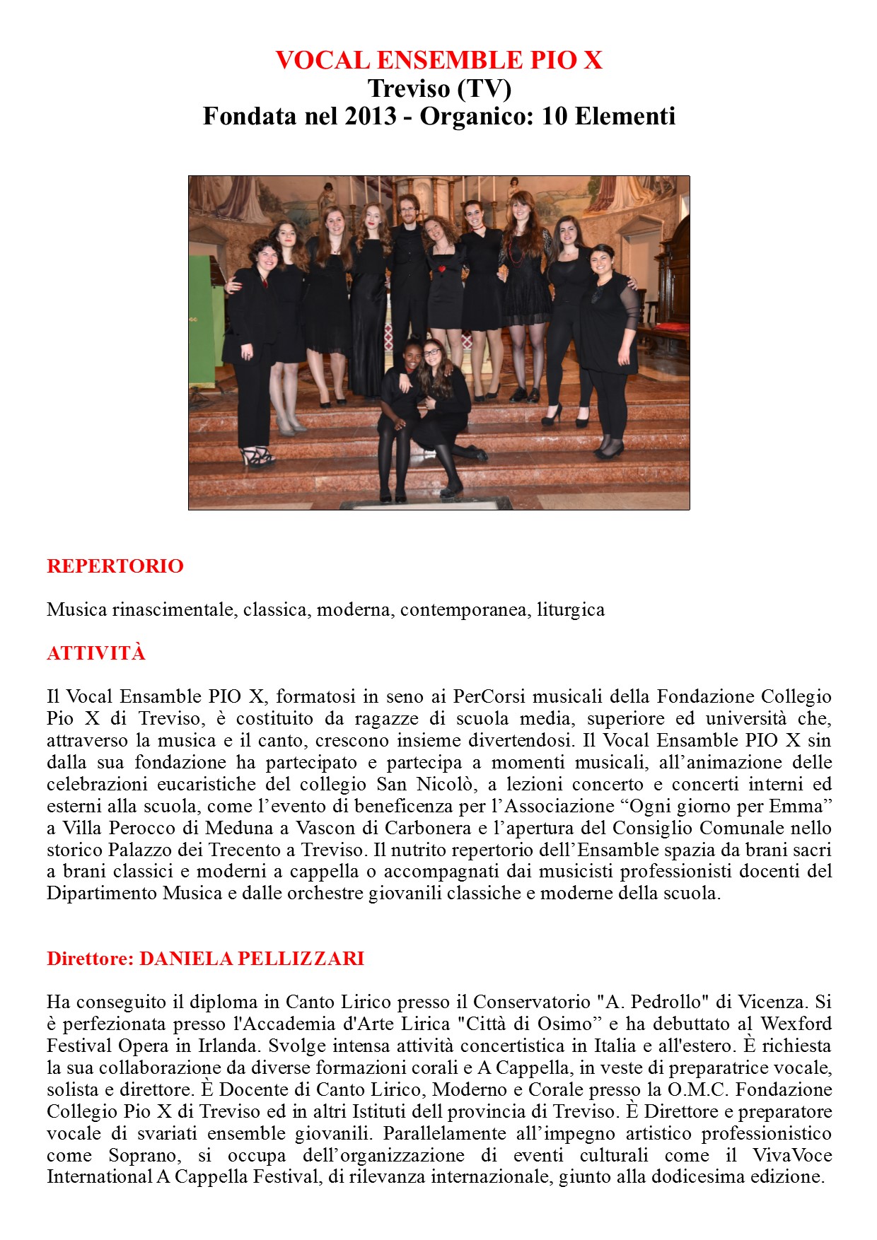 • VOCAL ENSEMBLE PIO X di Treviso, anch’esso diretto dal Maestro Daniela Pellizzari, che proporrà al pubblico ripano brani di musica rinascimentale, classica, moderna, contemporanea, liturgica. Il Vocal Ensemble Pio X, formatosi in seno ai PerCorsi musicali della Fondazione Collegio Pio X di Treviso, è costituito da ragazze di Scuola Media, Superiore ed Università che, attraverso la musica e il canto, crescono insieme divertendosi e, sin dalla sua fondazione partecipa a momenti musicali, all’animazione delle celebrazioni eucaristiche del collegio San Nicolò, a lezioni concerto e concerti interni ed esterni alla scuola,
