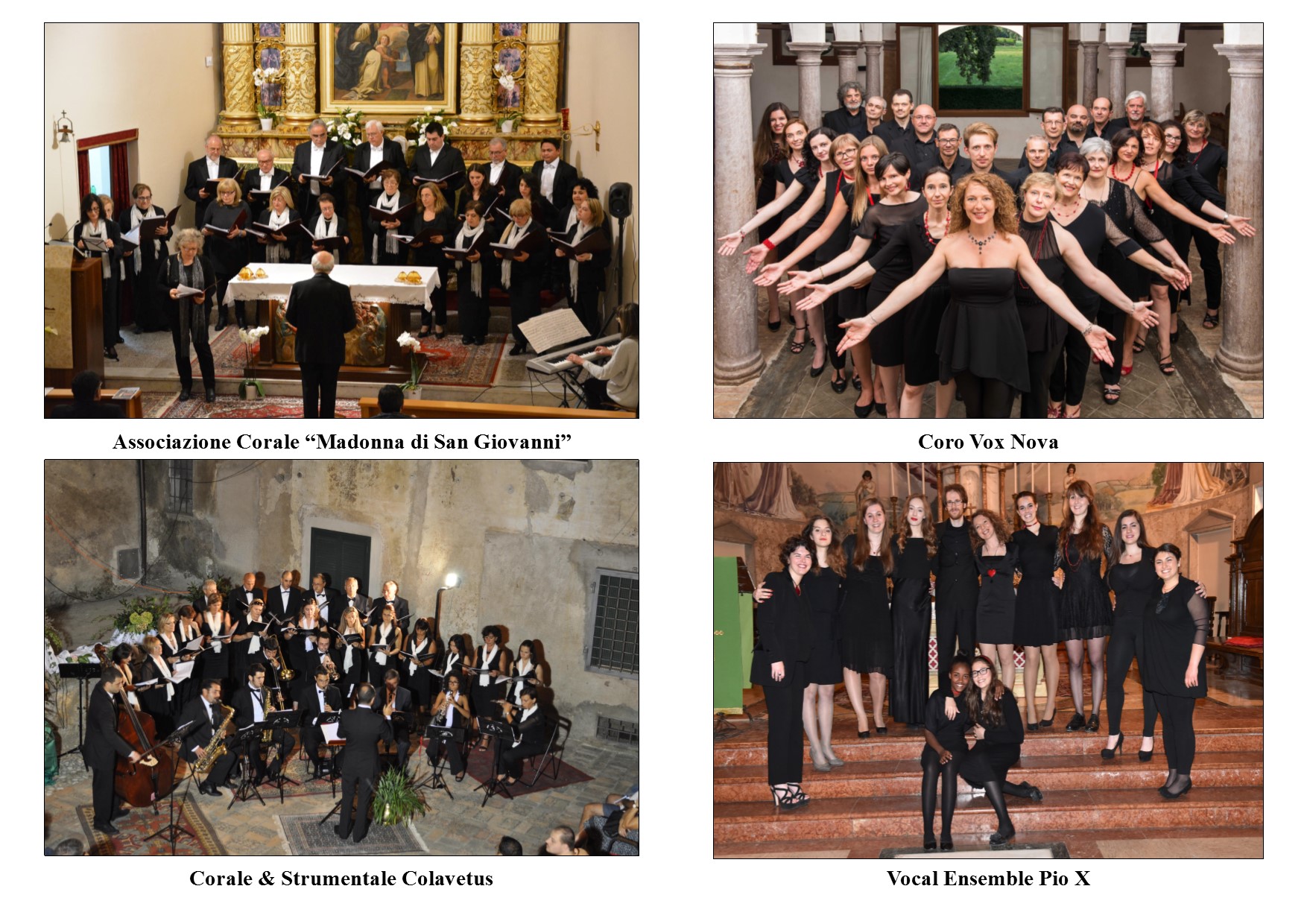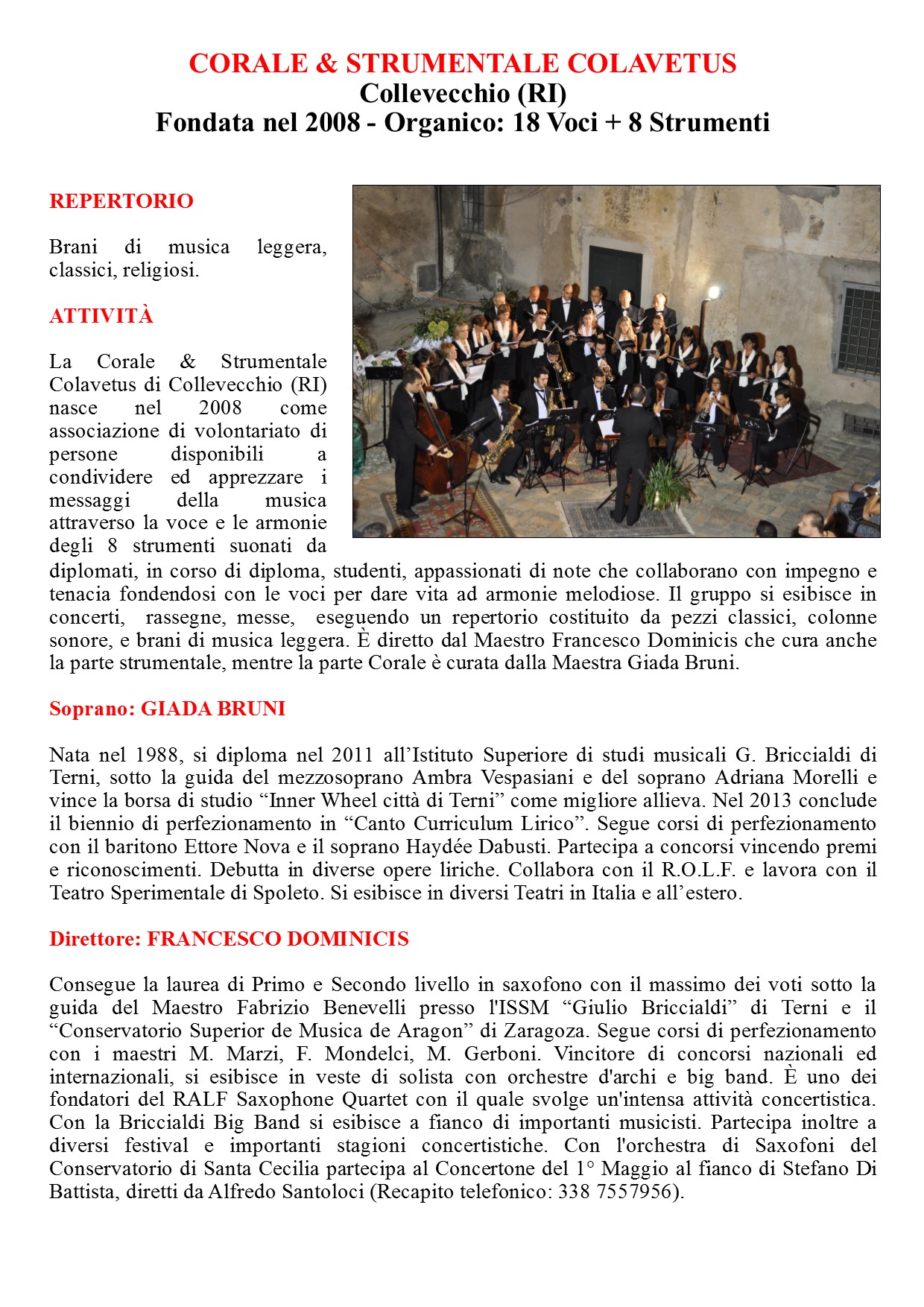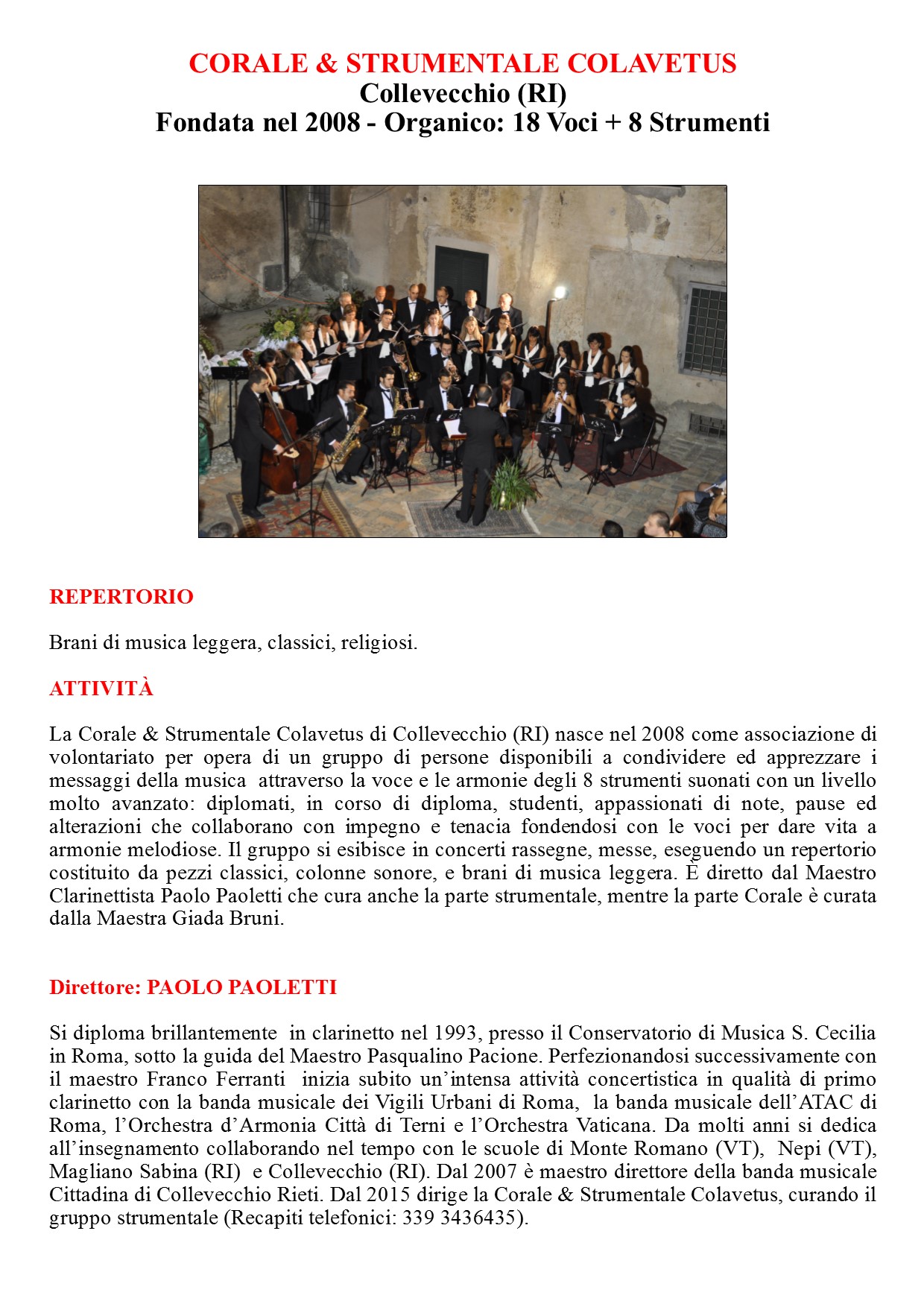 • CORALE & STRUMENTALE COLAVETUS di Collevecchio (RI), diretta dal Maestro Francesco Dominicis (parte vocale e strumentale) e dal Maestro Giada Bruni (parte corale), che proporrà al pubblico della Rassegna brani del proprio repertorio fatto di musica leggera, classica e religiosa. La Corale & Strumentale Colavetus nasce nel 2008 come associazione di volontariato per opera di un gruppo di persone disponibili a condividere ed apprezzare i messaggi della musica attraverso la voce e le armonie degli 8 strumenti suonati con un livello molto avanzato.