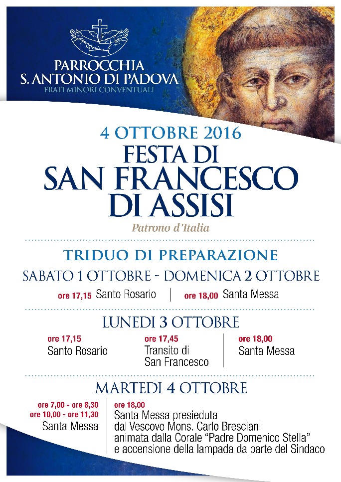 Oggi lunedì 3 Ottobre si terrà alle ore 17.15 il Santo Rosario alle ore 17.45 la celebrazione del transito di San Francesco e alle ore 18.00 la Santa Messa