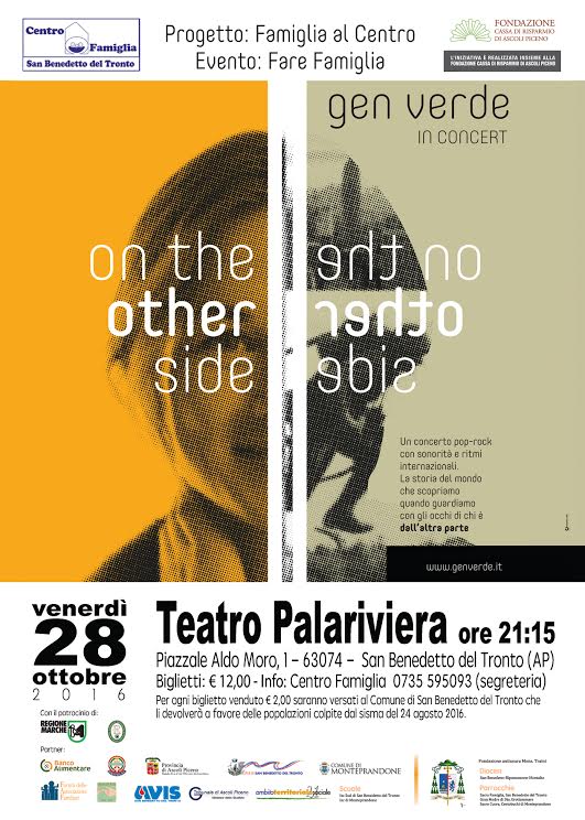Il concerto. In occasione della giornata evento Fare Famiglia, il Centro Famiglia invita la cittadinanza al concerto-spettacolo “On the Other Side”, performance consolidata del Gen Verde International Performing Arts Group. Sul palco saliranno 22 artiste provenienti da 14 nazioni che si esibiranno in un viaggio musicale tra gli stili e le tradizioni dall’etno-music al rock, dalla musica pop al reggae. E non solo: video, luci, suono, coreografie faranno da cornice a un mix eclettico di contributi multimediali che faranno da scenario e accompagneranno le canzoni scritte dai membri del Gen Verde in cinque lingue. Le esibizioni del Gen Verde sono diventate il simbolo di una rivoluzione culturale in cui la musica è lo strumento condiviso per contribuire a realizzare un mondo più unito e fraterno.