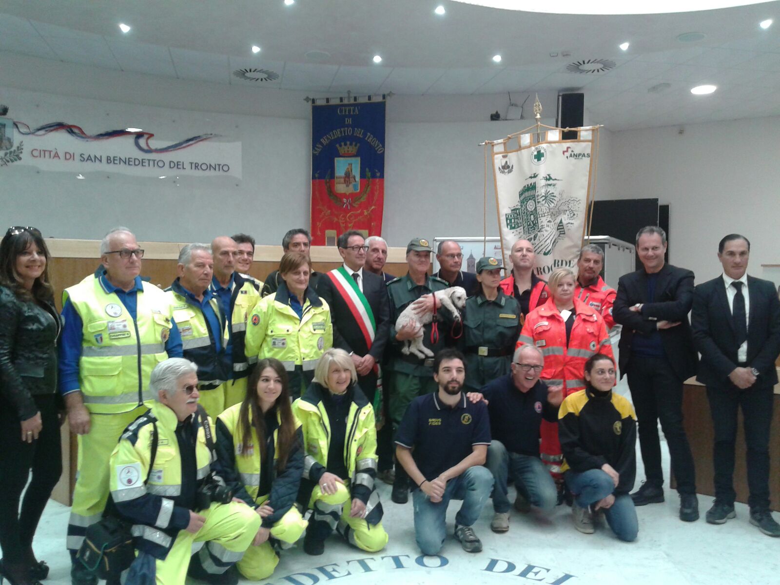 Questa la motivazione, letta dal Sindaco Pasqualino Piunti nel corso della cerimonia: “Nelle ore immediatamente successive al terribile terremoto del 24 agosto 2016 decine di volontari, tra cui tantissimi giovani, si sono spontaneamente messi a disposizione per raccogliere, catalogare e organizzare i tantissimi beni di prima necessità donati dai sambenedettesi, dando grande dimostrazione di generosità e sensibilità. La città riconoscente li ringrazia e li indica quale esempio da seguire per costruire un futuro migliore per il nostro Paese”.