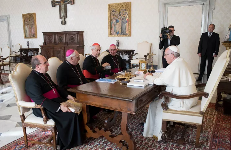 Il Comitato esecutivo della Conferenza episcopale argentina ha incontrato stamattina Papa Francesco nel Palazzo apostolico, un incontro “fraterno e vivace”, caratterizzato da “allegria e spirito”. Così lo descrivono i vescovi, che hanno rinnovato al Papa l’invito ad accoglierlo in visita ufficiale in Argentina. L’incontro, informano in una nota pervenuta al Sir, “è durato più di 40 minuti e i vescovi hanno parlato con il Santo Padre di questioni relative alla vita pastorale della Chiesa nel nostro Paese. Si è parlato delle iniziative svolte nell’ambito dell’Anno Santo della Misericordia e di come sono state vissute nelle diocesi e comunità”. Prima di partecipare alla Messa di ringraziamento per la canonizzazione del cura Brochero i vescovi hanno donato al Papa una scultura realizzata dallo stesso Brochero. Erano presenti il presidente dei vescovi argentini mons. José María Arancedo, arcivescovo di Santa Fe; il cardinale Mario Poli, arcivescovo di Buenos Aires e vice presidente della Cea; monsignor Mario Cargnello, vice presidente e arcivescovo di Salta; il segretario generale monsignor Carlos H. Malfa, vescovo di Chascomús.