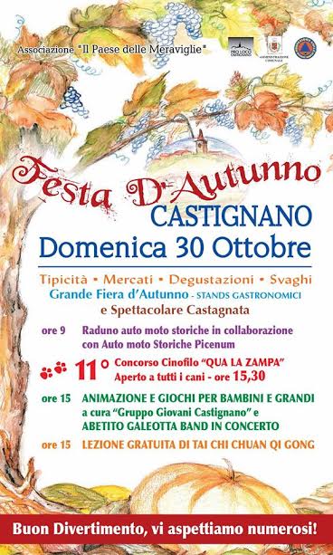 CASTIGNANO – Domenica 30 ottobre a Castignano avrà luogo la “Grande Festa d’Autunno” con stand gastronomici e mercatini dai colori autunnali. La festa inizierà alle ore 9.00 con un raduno di auto e moto storiche in collaborazione con Auto Moto Storiche Picenum. Alle ore 15.00 vi saranno svaghi per grandi e bambini a cura del “Gruppo Giovani Castignano”, si esibirà in concerto “Abetito Galeotta Band” e si terrà una lezione gratuita di Tai Chi Chuan (arte marziale cinese). Alle 15.30 inizierà l’undicesima edizione del concorso cinofilo “Qua la Zampa” aperto a tutti i cani. Vi aspettiamo a Castignano per trascorrere una giornata immersi nei sapori autunnali.