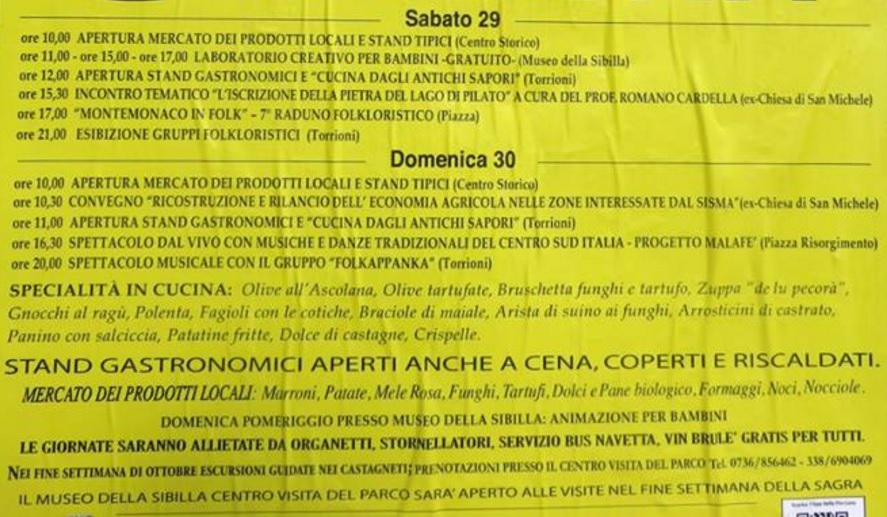 C’è una cosa bella che abbiamo notato a Montemonaco: nonostante la paura e il disagio la comunità non ha abbandonato la speranza e sta preparando la 39° sagra-mercato della castagna per il 29 e 30 ottobre.