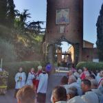 Dopo il pranzo, frugale ma consumato in un clima di festosa condivisione, è iniziato il rito giubilare vero e proprio. Questo si è svolto dapprima attraverso una breve processione, la quale si è snodata dal vecchio santuario eretto nel 1745 fino alla nuova e coloratissima chiesa costruita nel 1999, passando attraverso la Porta Santa giubilare che è stata ricavata nella suggestiva location della Torre del Miracolo che racchiude l’icona della Madonna del Divino Amore.